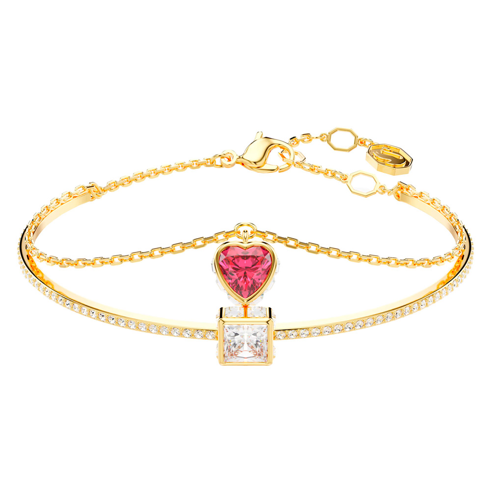 Очаровательный двойной браслет из коллекции Chroma состоит из жесткого обруча с прозрачным паве и прозрачным кристаллом Swarovski в центре и цепочки, украшенной красным кристаллом Swarovski в форме сердца, дополненным прозрачными кристаллами квадратной огранки по краям. Этот браслет станет идеальным подарком для любимого человека. Регулируемая длина. Застежка - карабин.