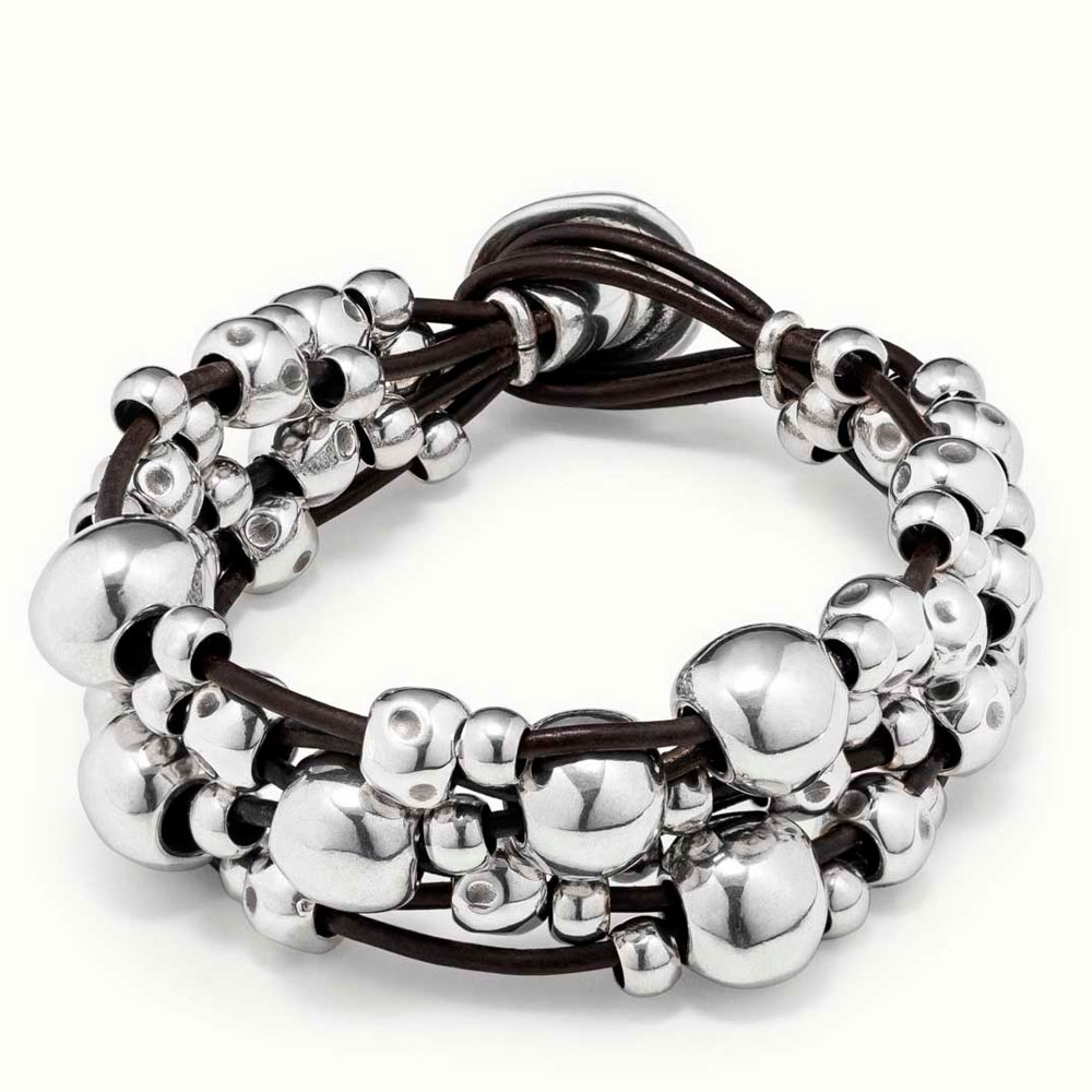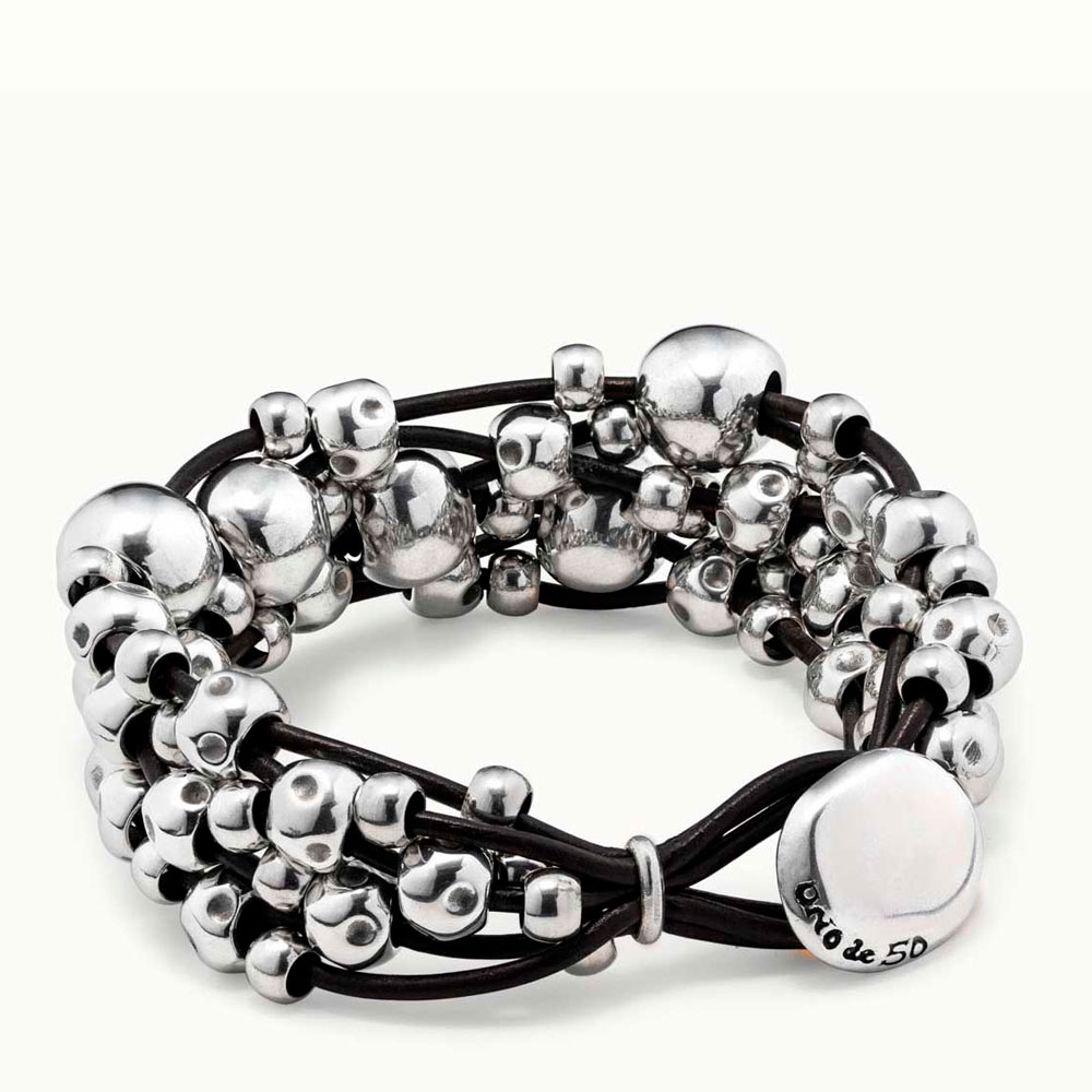 Прекрасный браслет на пяти шнурках из коричневой кожи. Множество посеребренных бусин, напоминающих жемчужины разного размера, красиво переплетаются и заканчивается простой и оригинальной застежкой-петлей. Это украшение подходит к повседневному образу. Не отказывайте себе в удовольствии похвастаться изящным аксессуаром от UNOde50, созданным полностью вручную в Испании.
