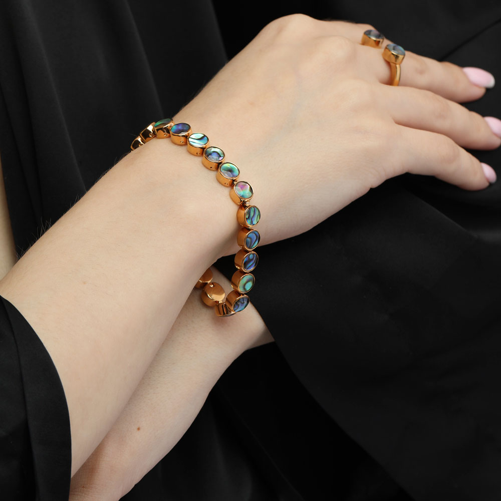 Описание: Изготовлено из ювелирного сплава на основе латуни с гальваническим покрытием золотом. Изделие украшает гелиотис диаметром 6мм. Длина 18-20см.