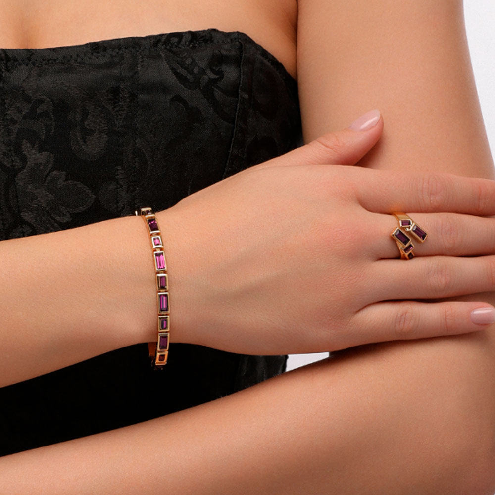 Описание: Изготовлено из ювелирного сплава на основе латуни с гальваническим покрытием золотом. Изделие украшают кристаллы SW темно-аметистового цвета. Длина 17-20см. Ширина 5мм.