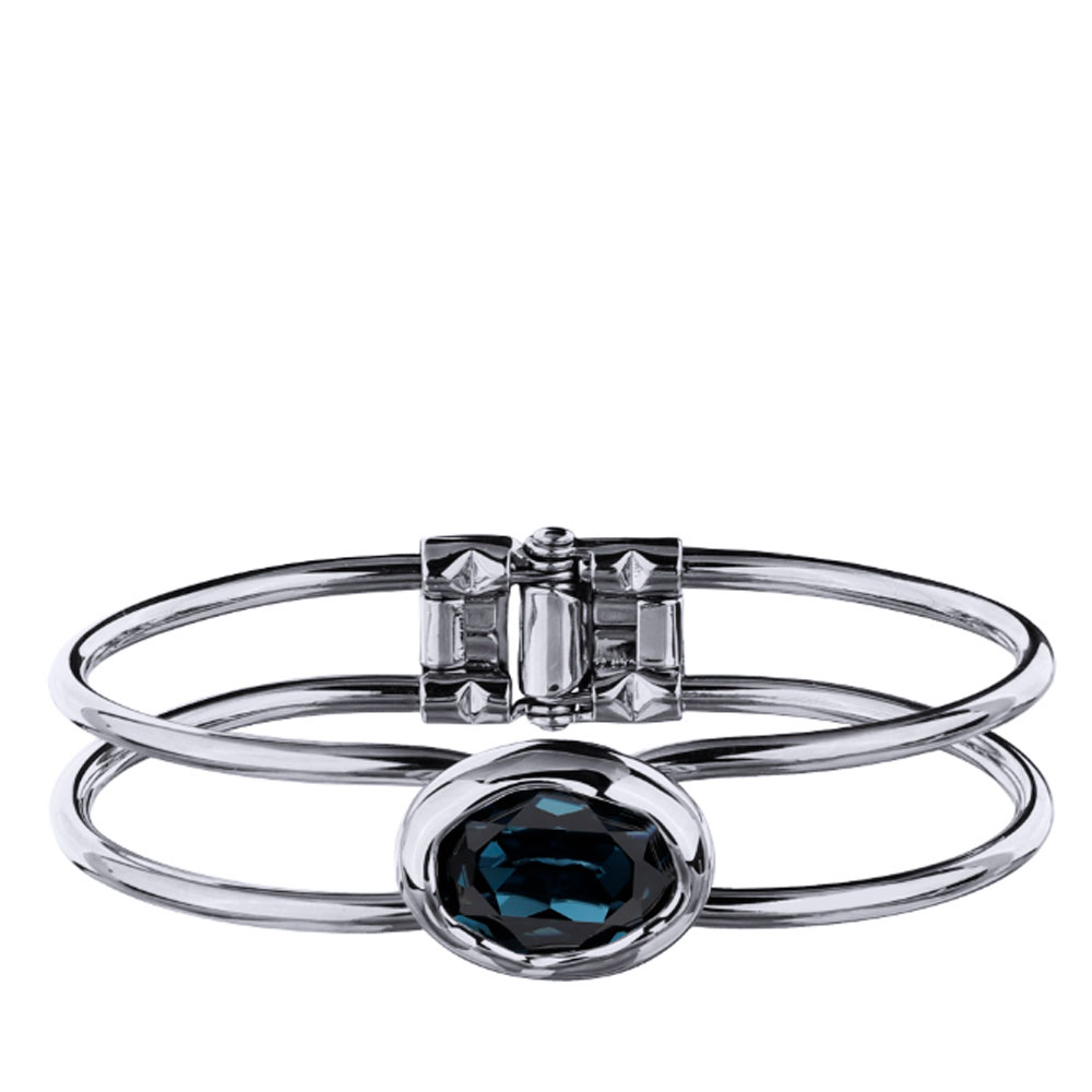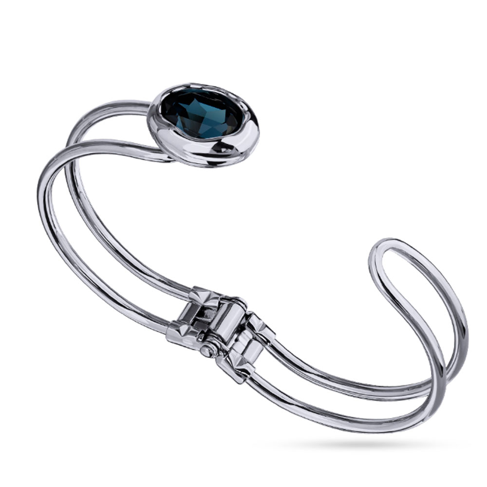 Описание: Изготовлено из ювелирного сплава на основе латуни с гальваническим покрытием родием. Изделие украшают кристаллы SW темно-синего цвета. Размер кристалла 18х13мм. Размер браслета 6.2х4.5см.