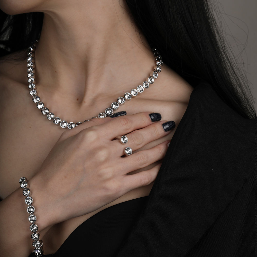 Описание: Изготовлено из ювелирного сплава на основе латуни с гальваническим покрытием родием. Изделие украшают кристаллы SW белого цвета диаметром 6мм. Длина 18-20см.