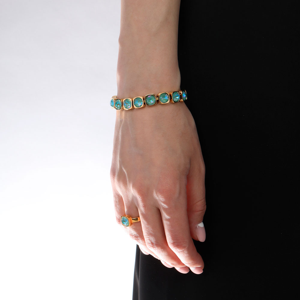 Описание: Изготовлено из ювелирного сплава на основе латуни с гальваническим покрытием золотом. Изделие украшают кристаллы SW мятного цвета диаметром 8мм. Длина 17-19см