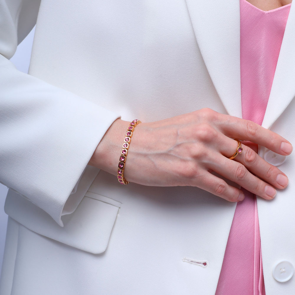Описание: Изготовлено из ювелирного сплава на основе латуни с гальваническим покрытием золотом. Изделие украшают кристаллы SW розового цвета диаметром 4мм. Длина 17 — 19см