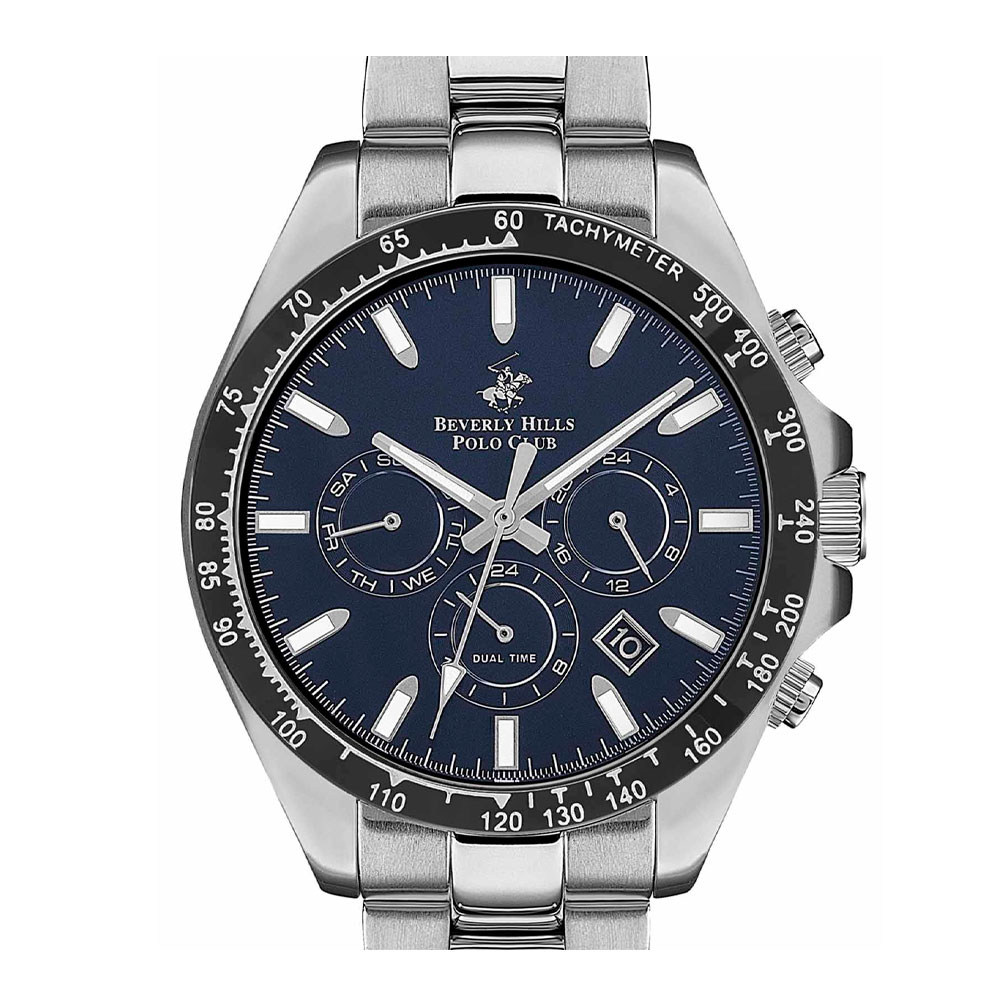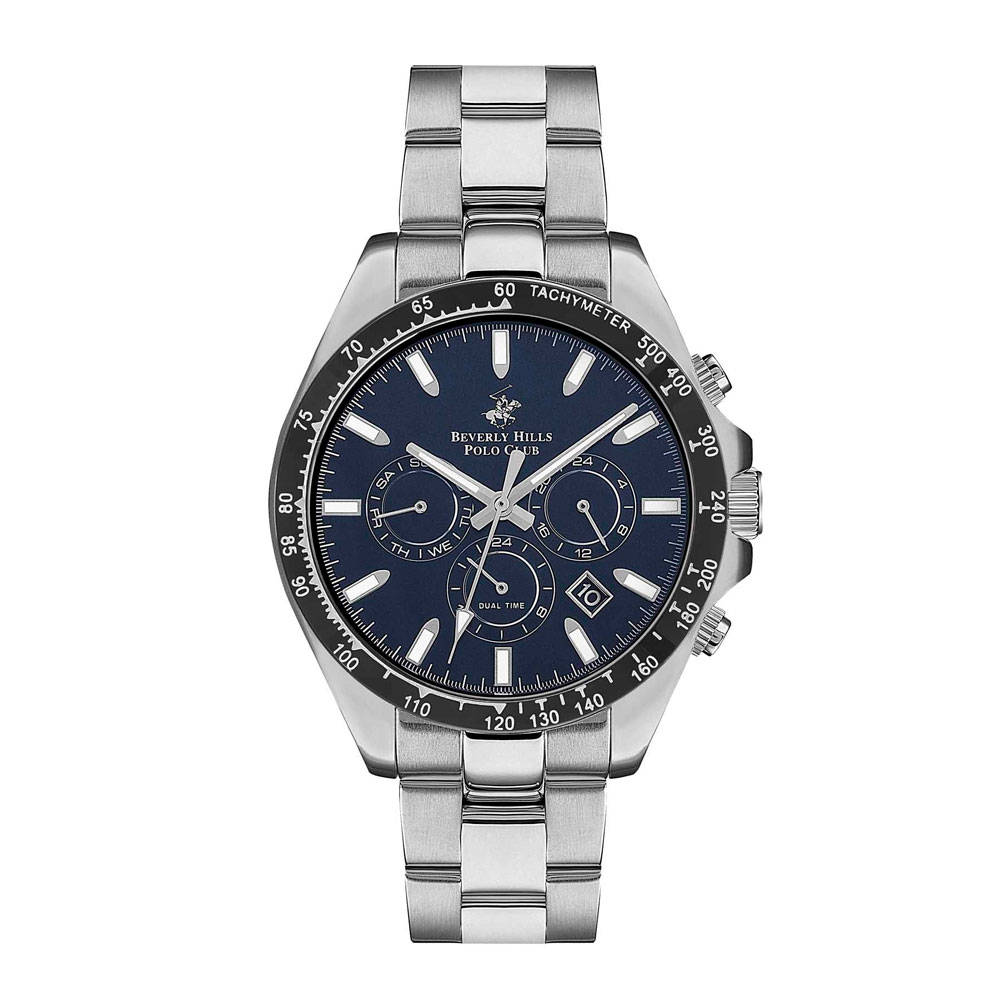 Beverly Hills Polo Club BP3127X.392 — практичные и выразительные часы для повседневного ритма. Корпус 42 мм из нержавеющей стали подчёркнут безелем с PVD-покрытием и функциональным тахиметром, формирующим динамичный двухцветный облик. Циферблат с хорошо читаемыми метками и датой между 4 и 5 часами закрыт прочным минеральным стеклом. Кварцевый механизм обеспечивает точный ход без подзавода. Стальной браслет укомплектован раскладной застёжкой. Водозащита — 100 м.