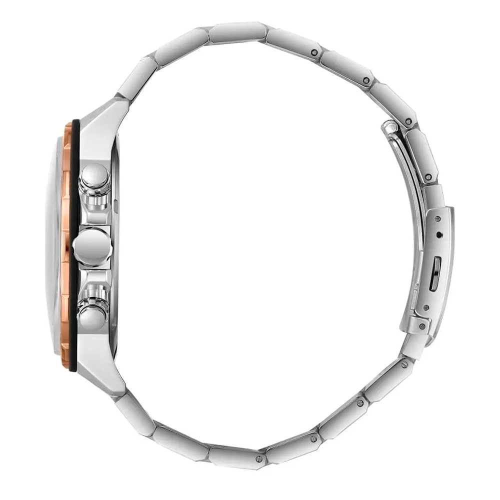 Модель оснащена кварцевым механизмом, который обеспечивает точное измерение времени. Металлический браслет серебристого цвета на раскладной застёжке обеспечивает комфортное ношение и надёжную фиксацию.
