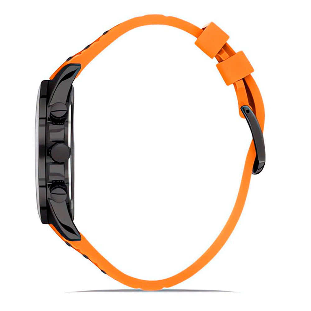 Мужские кварцевые часы. Калибр механизма JP15-3. Центральные часовая, минутная и секундная стрелки. Апертура даты в позиции 4 часов. Отображение дня недели в малом циферблате. 12/24х часовой формат времени. Второй часовой пояс. Черный циферблат. Круглый корпус выполнен из нержавеющей стали с черным IP покрытием. Диаметр корпуса составляет 45 мм. Заводная головка с защитой. Оранжевый силиконовый ремешок, стандартная застежка. Прочное минеральное стекло устойчивое к мелким механическим повреждениям. Водостойкость WR 50 (мытье рук, дождь).