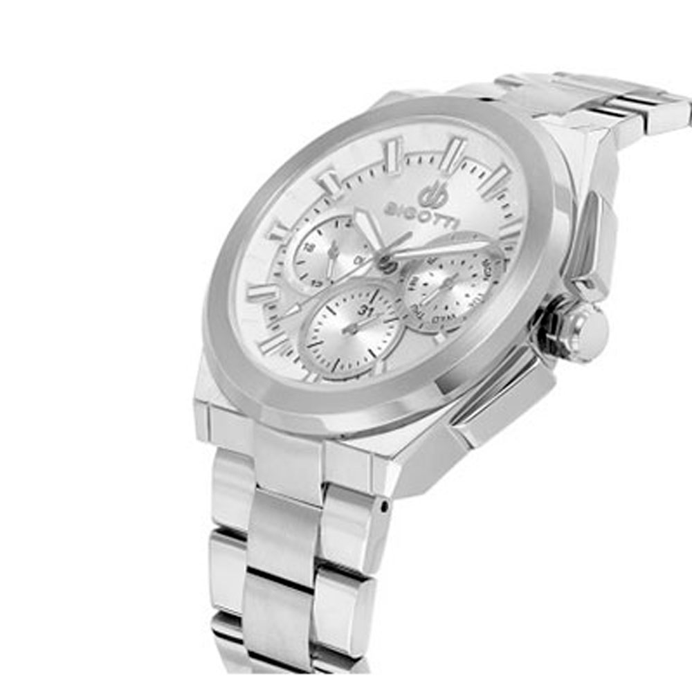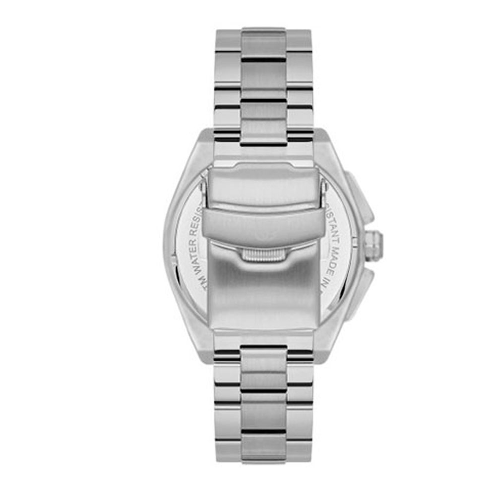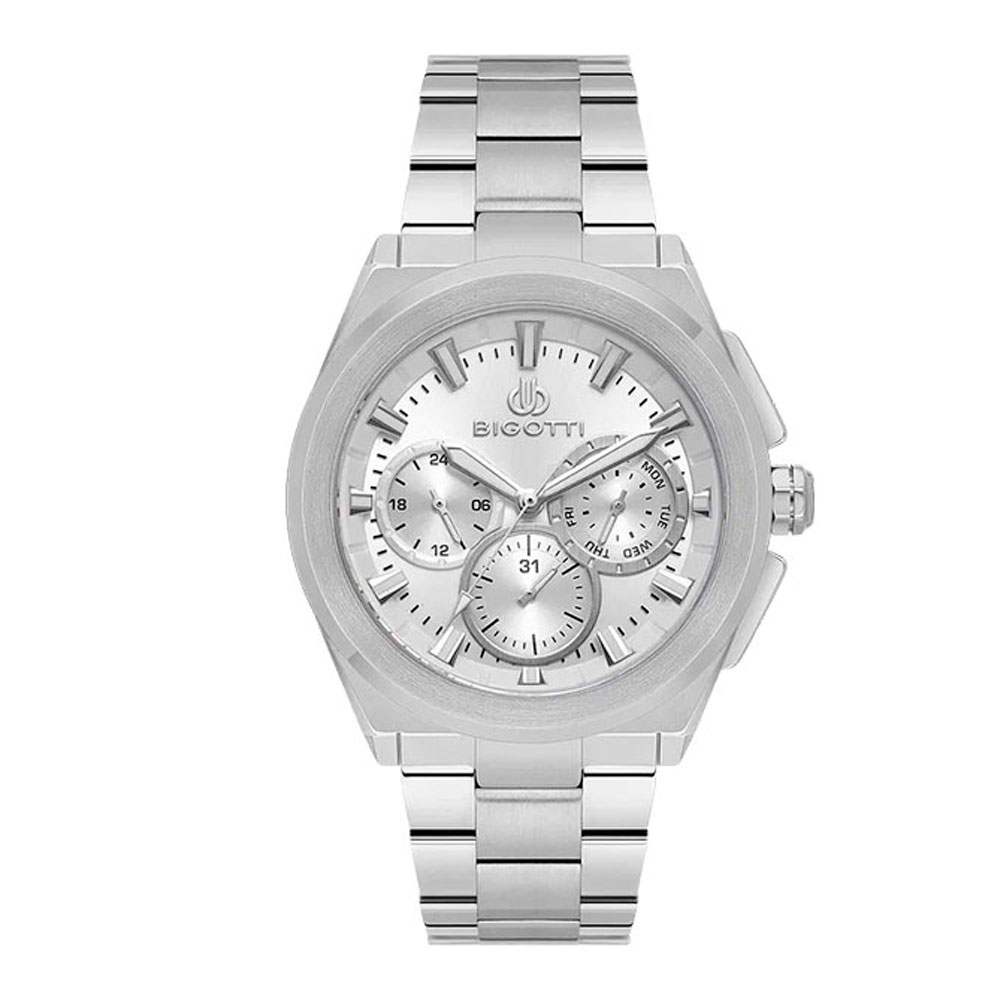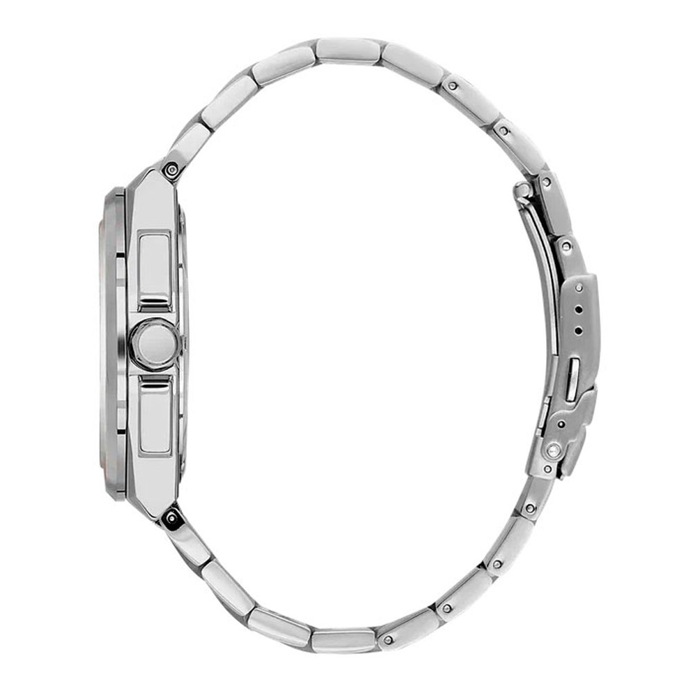 Мужские кварцевые часы. Центральные часовая, минутная и секундная стрелки. Отображение даты и дня недели в малых циферблатах. 12/24х часовой формат времени. Серебристый циферблат. Круглый корпус выполнен из нержавеющей стали. Диаметр корпуса составляет 45 мм, толщина 12,5 мм. Стальной браслет, раскладывающаяся застежка. Прочное минеральное стекло устойчивое к мелким механическим повреждениям. Водостойкость WR 30 (брызги).