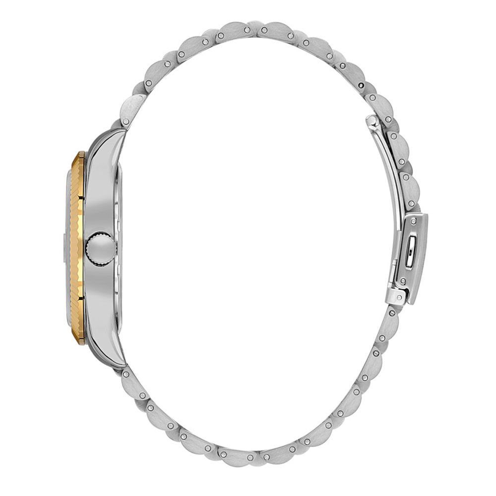Мужские кварцевые часы. Калибр механизма 2315. Центральные часовая, минутная и секундная стрелки. Апертура даты с увеличительным стеклом в позиции 3 часов. Серебристый циферблат. Круглый корпус выполнен из нержавеющей стали с частичным IP покрытием цвета желтого золота. Диаметр корпуса составляет 41 мм. Стальной браслет с частичным покрытием, раскладывающаяся застежка. Прочное минеральное стекло устойчивое к мелким механическим повреждениям. Водостойкость WR 50 (мытье рук, дождь).