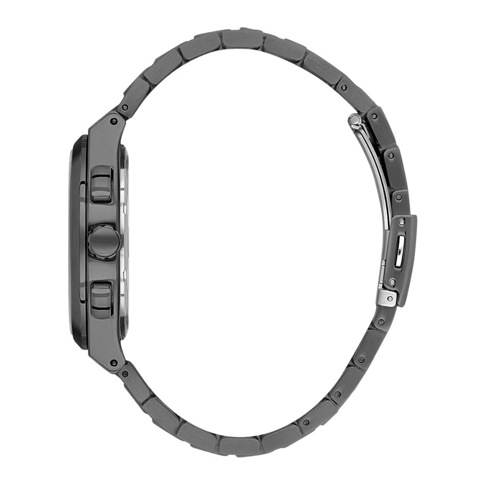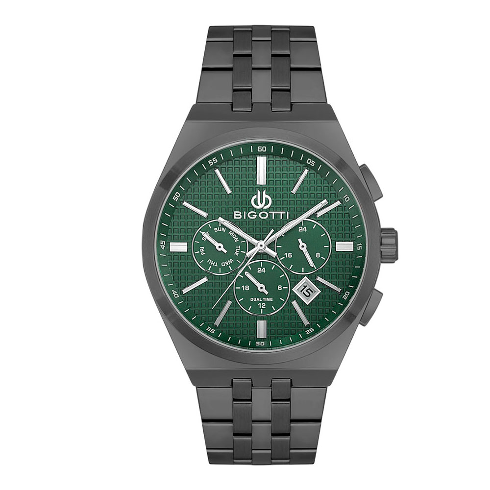 Мужские кварцевые часы. Калибр механизма JP25. Центральные часовая, минутная и секундная стрелки. Апертура даты между 4 и 5 часами. Отображение дня недели в малом циферблате. Второй часовой пояс. 12/24х часовой формат времени. Зеленый циферблат. Круглый корпус выполнен из нержавеющей стали с серым IP покрытием. Диаметр корпуса составляет 43 мм. Стальной браслет с покрытием, раскладывающаяся застежка. Прочное минеральное стекло устойчивое к мелким механическим повреждениям. Водостойкость WR 50 (мытье рук, дождь).