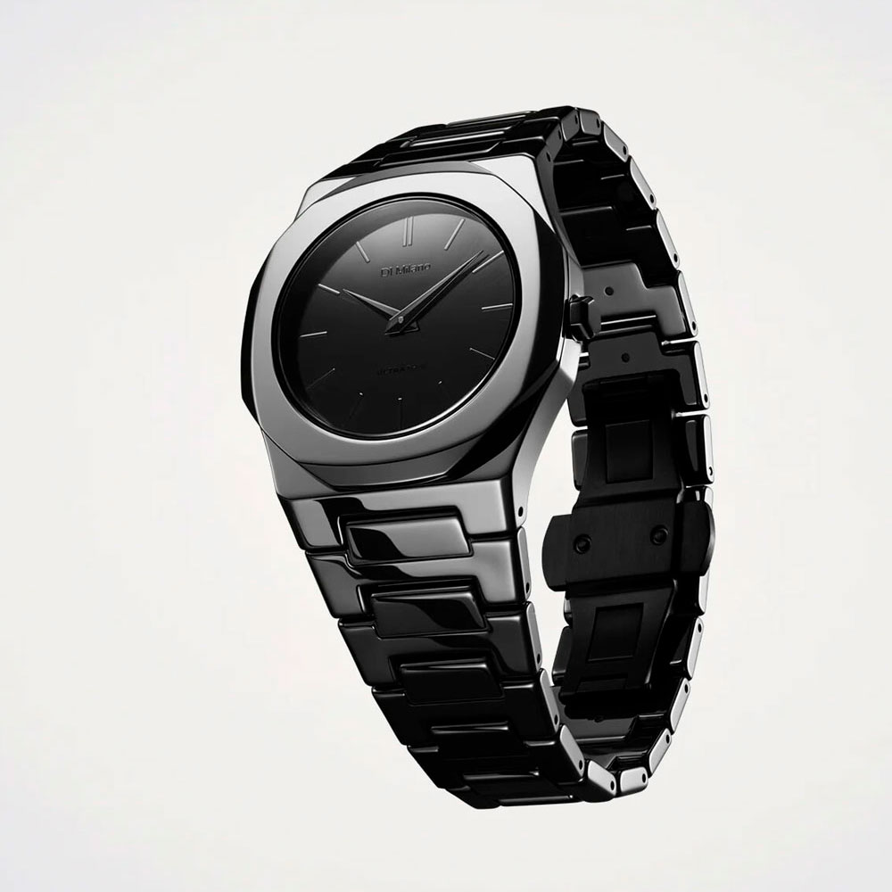 Наручные часы Black Mirror. Ультратонкие. Стальной корпус. Циферблат с метками в виде штрихов. Клиновидные стрелки в стиле Dauphine. Задняя крышка крепится на 8-ми винтах. Индивидуальный серийный номер. Браслет с раскладывающейся застежкой.