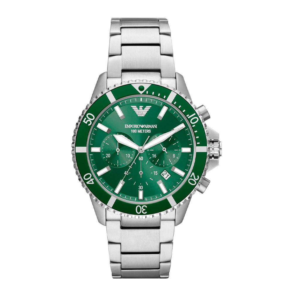 Часы-хронограф от Emporio Armani раскроют мужественный и спортивный характер своего обладателя. Diver. Часы-хронограф с секундомером. Циферблат выполнен по технологии Sunray (солнечные лучи). Метки в виде штрихов. Окошко даты находится между отметками 4 и 5 часов. Заводная головка с защитой. Браслет с раскладывающейся застежкой. Застежка с системой блокировки.
