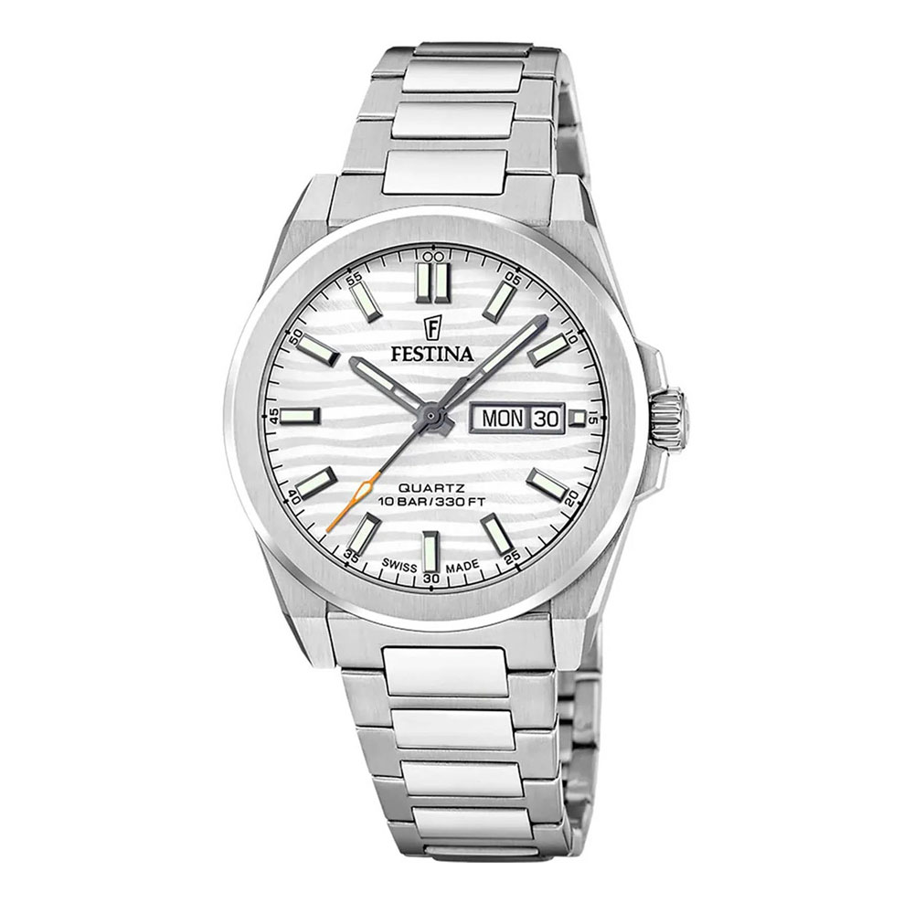 Мужские кварцевые часы Festina F20073/1 из коллекции Swiss Made — это стильный аксессуар с швейцарским качеством и повседневным дизайном. Корпус диаметром 40 мм выполнен из нержавеющей стали серебряного цвета. Циферблат белого цвета дополнен окошком даты и дня недели в положении 3 часов. Циферблат защищён сапфировым стеклом. Секундная стрелка — оранжевого цвета, что добавляет модели яркий акцент. Заводная головка — вытягивающегося типа, задняя крышка — завинчивающаяся. Часы оснащены стальным браслетом на раскладной застёжке с кнопками. Механизм — швейцарский кварцевый калибр Ronda 517 с 45-месячным сроком службы батареи. Водонепроницаемость 100 м позволяет использовать часы для плавания. Универсальный выбор для тех, кто ценит точность, надёжность и лаконичный стиль.