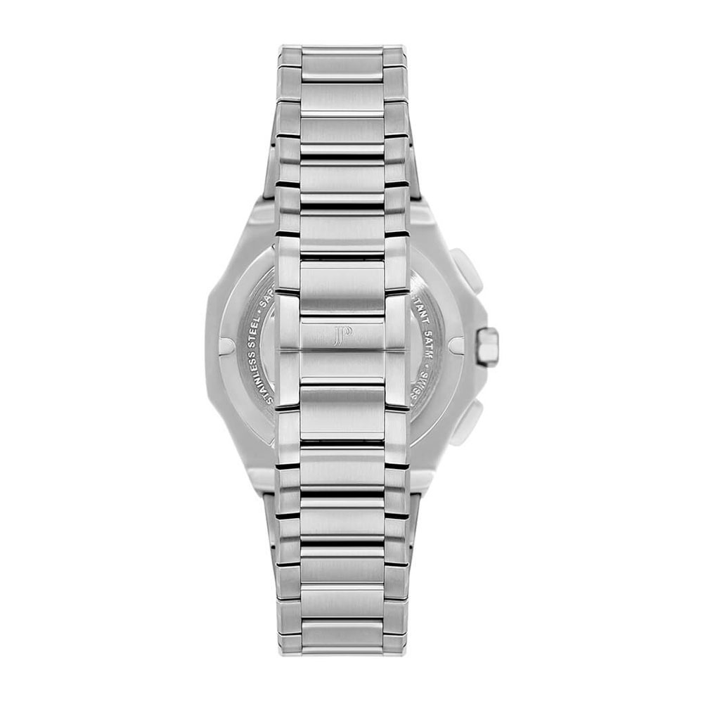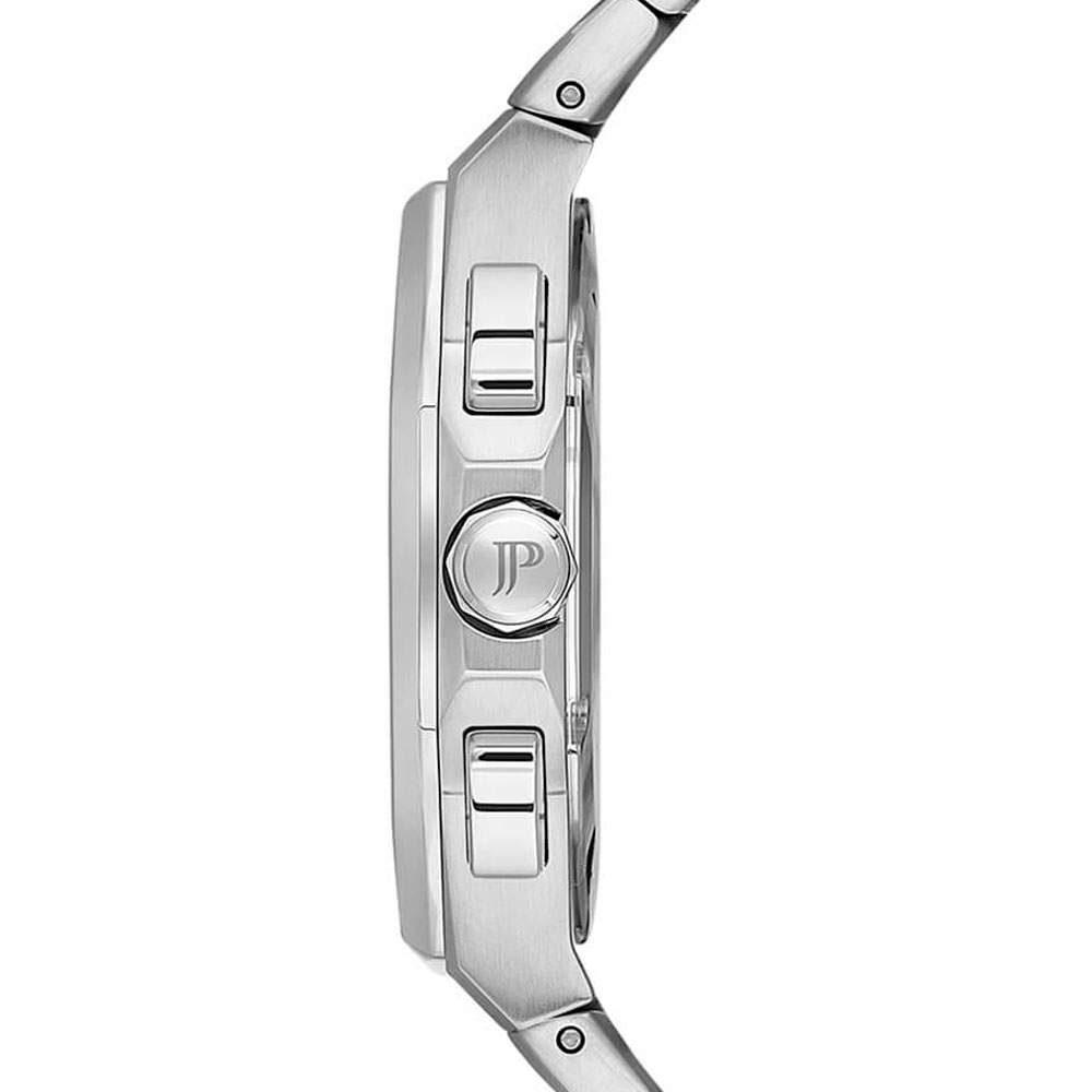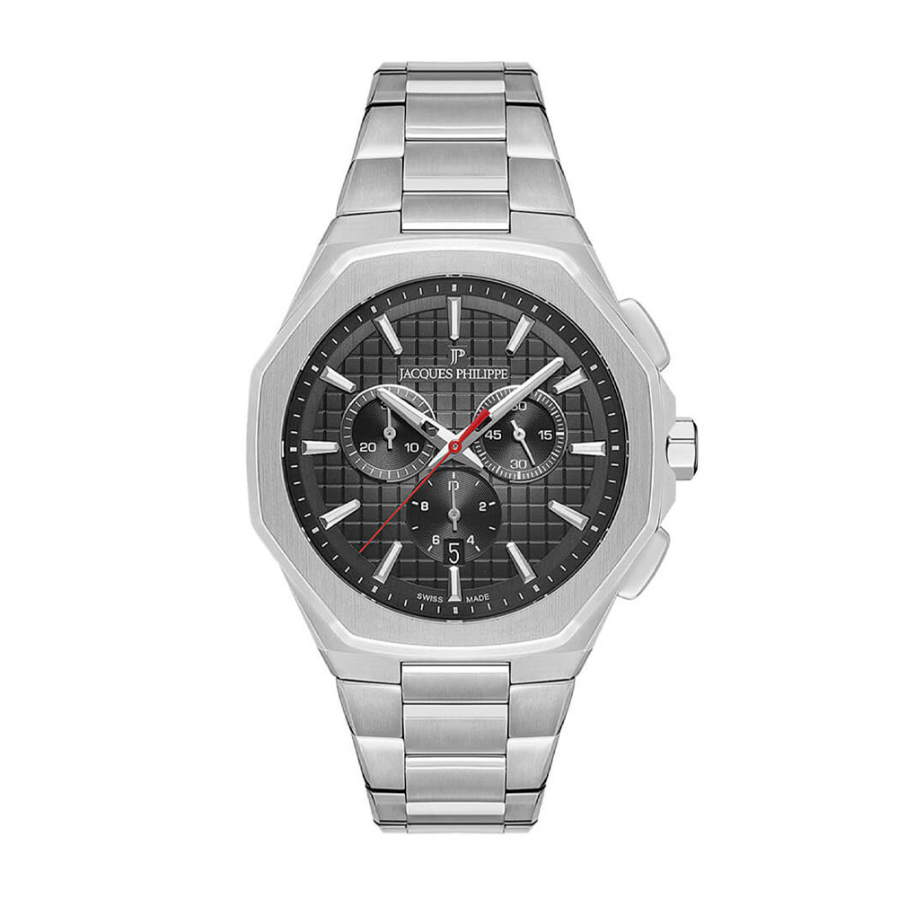 Швейцарские мужские часы-хронограф с секундомером Jacques Philippe Octagon JPQGC391316, кварцевый механизм с высокой точностью. Сапфировое стекло устойчивое к появлению царапин, обладающее высокой прозрачностью. Корпус часов изготовлен из нержавеющей стали. На циферблате три дополнительных индикатора. Стрелки и метки с люминесцентным покрытием. Окошко даты находится в положении 6 часов. Класс водозащиты: 50 метров, позволит защитить корпус от случайных брызг или капель дождя. Стальной браслет на застёжке «бабочка» с кнопками.