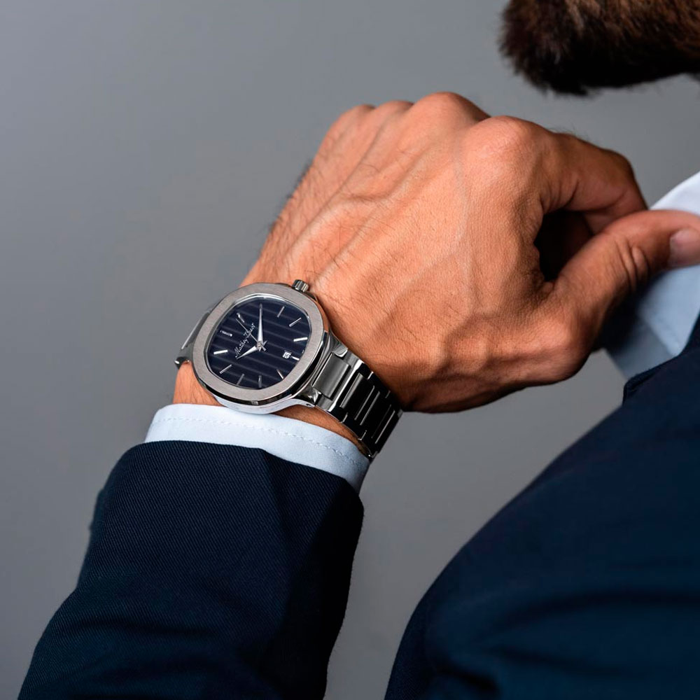 Простота и строгость форм, классический дизайн, ничего лишнего. Классика в лучшем исполнении! Evasion. Мужские часы со стальным корпусом. Рифленая заводная головка с защитой. Стальной браслет с застежкой-бабочкой.