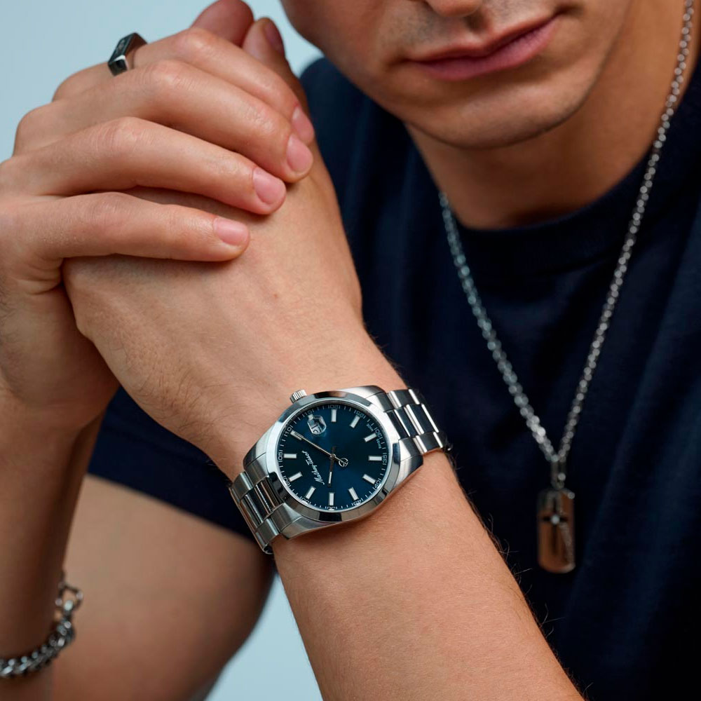 Часы со стильным дизайном станут любимым аксессуаром для настоящих мужчин. Mathy I. Мужские часы с круглым корпусом. Окошко даты с увеличительным стеклом. Циферблат с метками в виде штрихов выполнен по технологии Sunray (солнечные лучи). Рифленая заводная головка. Браслет с раскладывающейся застежкой.