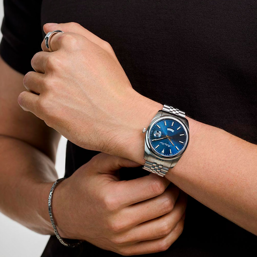 Стрелки и метки с люминесцентным покрытием SuperLumiNova, которое светится в темноте после непродолжительной зарядки на свету. Окошко даты с увеличительным стеклом находится в положении 3 часа. Индикация дня недели в положении 6 часов. Стальной браслет с раскладывающейся застежкой.