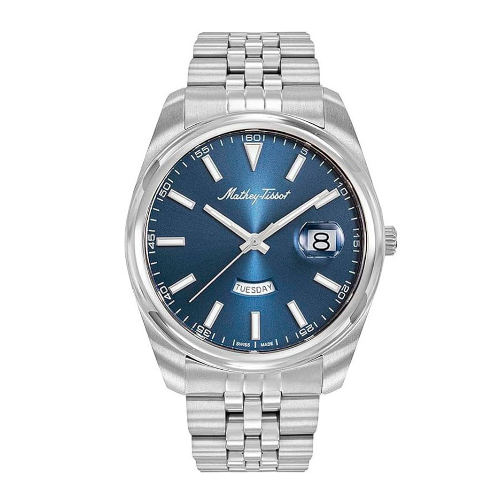 Мужские кварцевые часы Mathy Day-Date с круглым корпусом из нержавеющей стали. Циферблат с метками в виде штрихов защищен сапфировым стеклом.