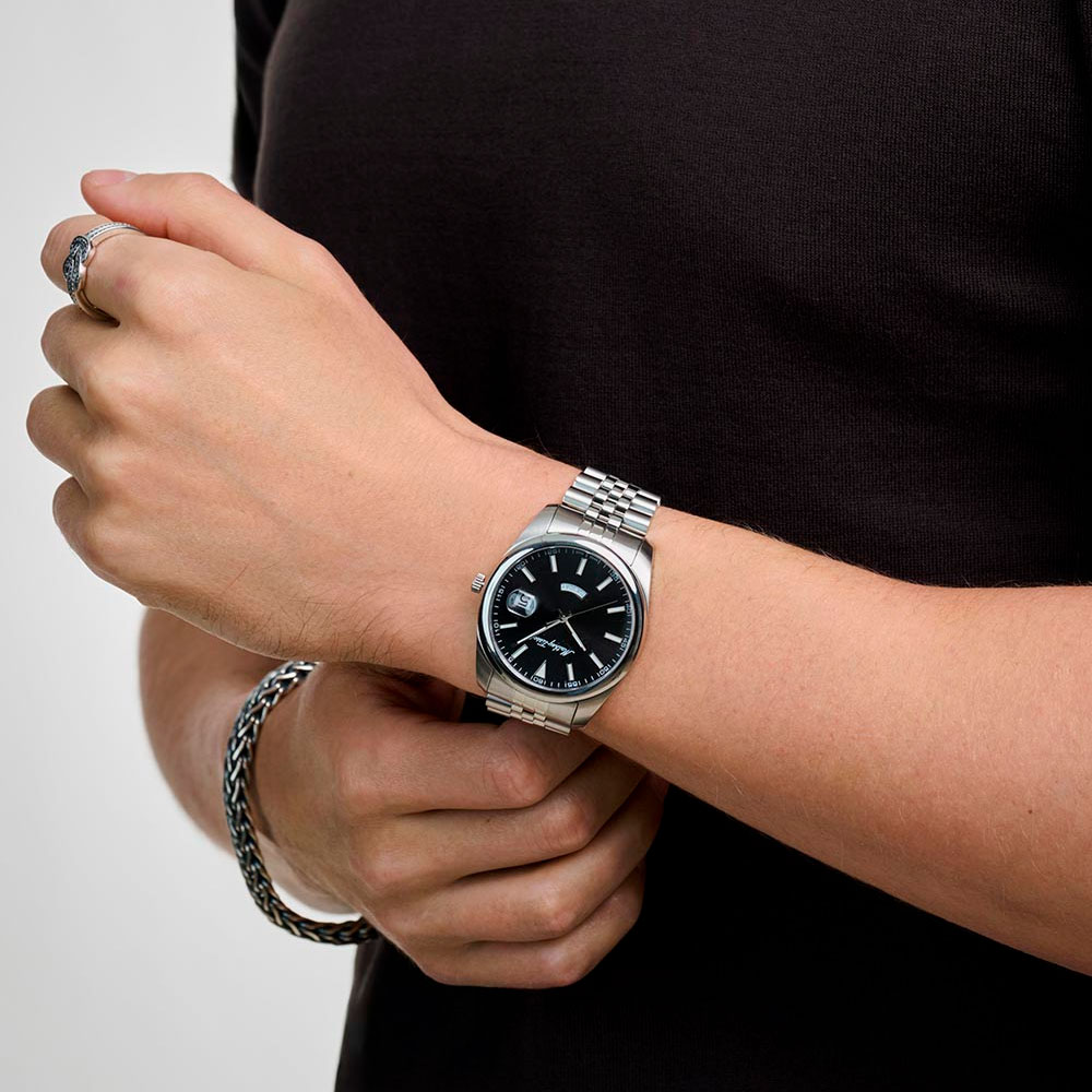 Стрелки и метки с люминесцентным покрытием SuperLumiNova, которое светится в темноте после непродолжительной зарядки на свету. Окошко даты с увеличительным стеклом находится в положении 3 часа. Индикация дня недели в положении 6 часов. Стальной браслет с раскладывающейся застежкой.