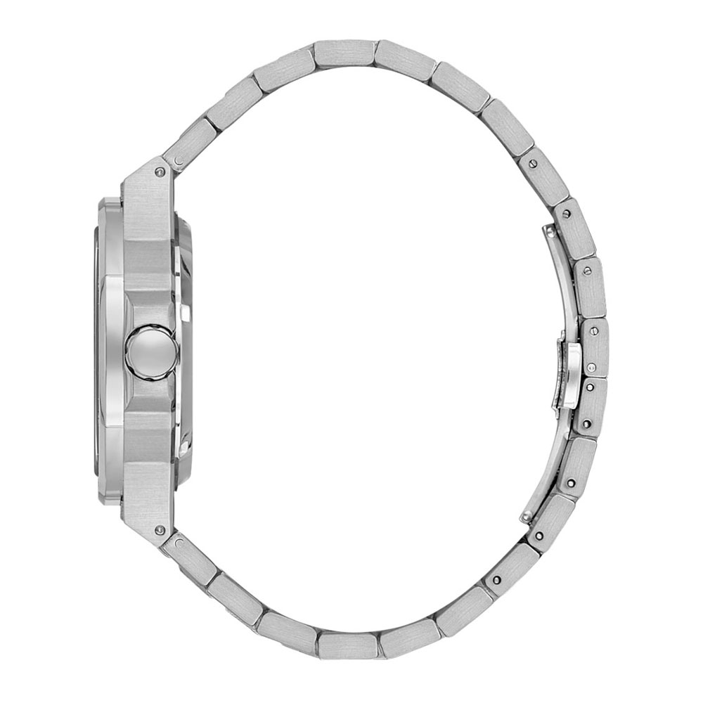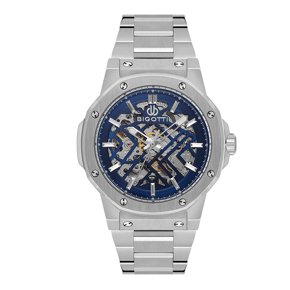 Мужские механические часы с автоподзаводом. Калибр механизма G2653. Центральные часовая, минутная и секундная стрелки. Синий скелетонизированный циферблат. Круглый корпус выполнен из нержавеющей стали. Диаметр корпуса составляет 43 мм. Стальной браслет, раскладывающаяся застежка. Прочное минеральное стекло устойчивое к мелким механическим повреждениям. Водостойкость WR 50 (мытье рук, дождь).