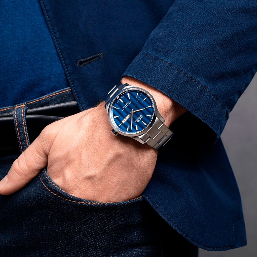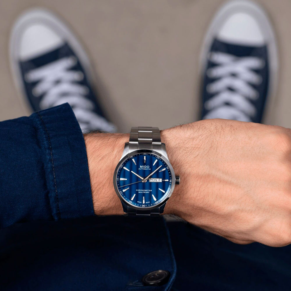 Часы MIDO Multifort Chronometer 1 (артикул M038.431.11.041.00) сочетают элегантный дизайн и высокую точность, сертифицированную COSC. Корпус диаметром 42 мм выполнен из нержавеющей стали с водозащитой до 10 бар (100 метров). Прозрачная задняя крышка подчёркивает изысканный механизм. Синий циферблат с узором «Côtes de Genève» оснащён накладными часовыми метками и стрелками с покрытием Super-LumiNova®. Окошки даты и дня недели расположены в положении «3 часа». Циферблат защищён сапфировым стеклом с двусторонним антибликовым покрытием.