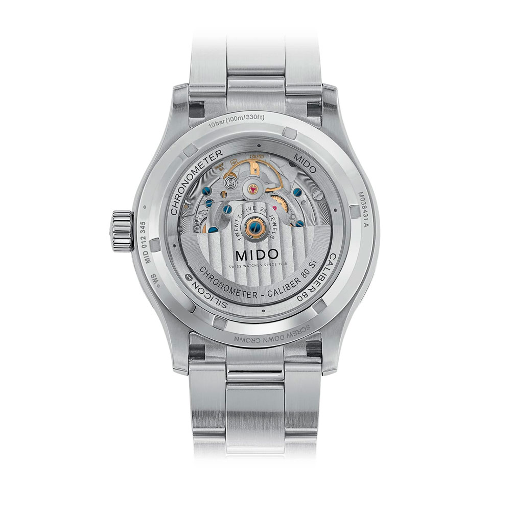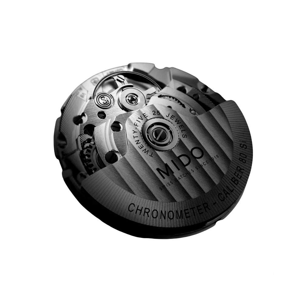 Модель оснащена автоматическим механизмом MIDO Caliber 80 Si с кремниевой пружиной баланса, обеспечивающим запас хода до 80 часов.