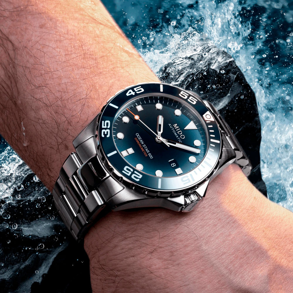 Часы MIDO Ocean Star 600 Chronometer (артикул M026.608.11.041.01) — высокотехнологичная модель, созданная для исследования океанских глубин. Корпус диаметром 43,5 мм выполнен из нержавеющей стали с керамическим безелем, заполненным люминесцентным составом Super-LumiNova® Grade X, и водозащитой до 60 бар (600 метров). Оснащён гелиевым клапаном. Синий циферблат с накладными часовыми метками, покрытыми Super-LumiNova®, защищён сапфировым стеклом с двусторонним антибликовым покрытием.