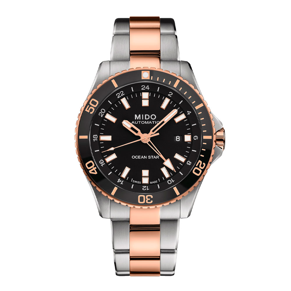Часы MIDO Ocean Star GMT (артикул M026.629.22.051.00) сочетают элегантность и функциональность, идеально подходя для путешественников и любителей водных видов спорта. Корпус диаметром 44 мм выполнен из нержавеющей стали с PVD-покрытием розового золота и керамическим безелем. Водозащита до 20 бар (200 метров) и завинчивающаяся заводная головка обеспечивают надёжность. Чёрный циферблат с накладными часовыми метками, покрытыми Super-LumiNova®, защищён сапфировым стеклом с двусторонним антибликовым покрытием.