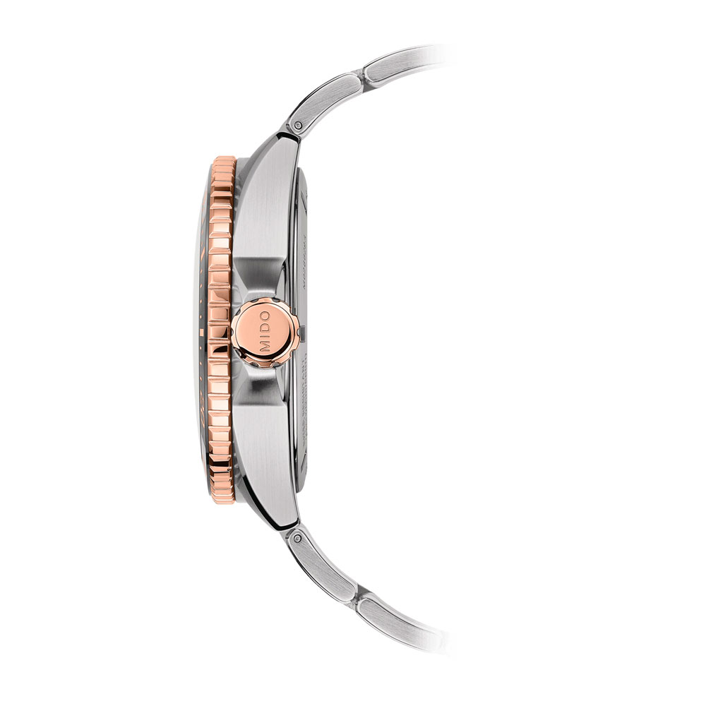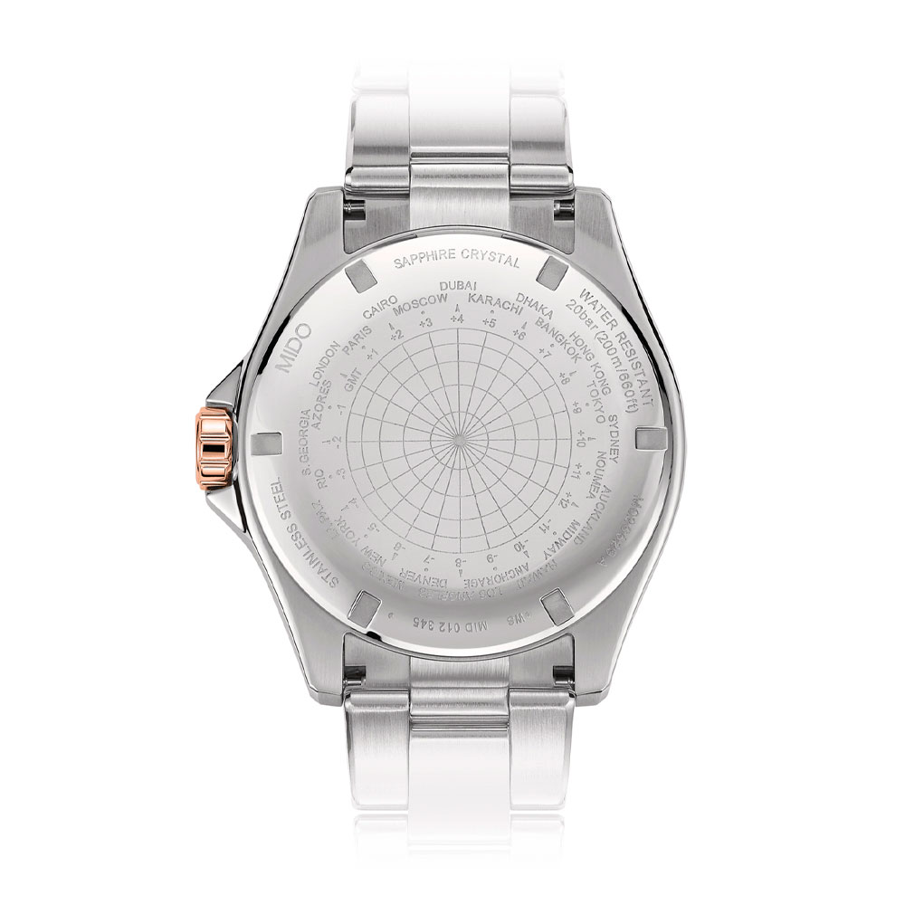 Модель оснащена автоматическим механизмом MIDO Caliber 80 (на базе ETA C07.661), обеспечивающим запас хода до 80 часов. Функционал включает индикацию часов, минут, секунд, даты в положении «3 часа» и второго часового пояса GMT.