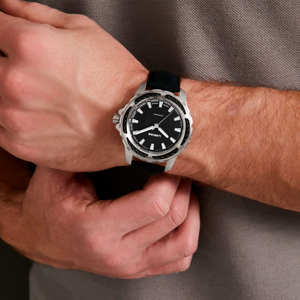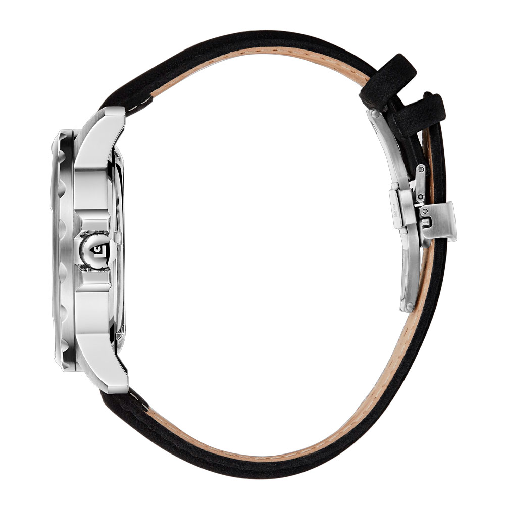 Брутальные мужские механические часы с автоподзаводом, которые станут надёжным и практичным спутником в любом образе. В оригинальный 47 миллиметровый корпус из нержавеющей стали установлено сапфировое стекло, устойчивое к появлению царапин. Ремешок чёрного цвета, изготовленный из износостойкого материала алькантара с внешней стороны и нубука - с внутренней, гармонично сочетается с металлическим канатом, обрамляющим фактурный корпус, и оттеняет объемные накладные индексы, на которые, как и на стрелки, нанесено люминесцентное покрытие. Прозрачная задняя крышка открывает вид на завораживающую работу механического механизма с автоподзаводом и запасом хода 35 ч., а водонепроницаемость 5 АТМ позволяет использовать часы в условиях повышенной влажности.
