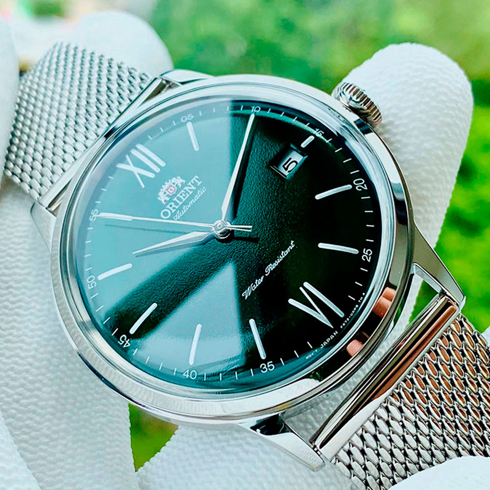Мужские механические японские часы с запасом хода 40 часов Orient Automatic RA-AC0018E, механический механизм (автоматический калибр) с высокой точностью. Класс водозащиты: 30 метров, позволит защитить корпус от случайных брызг или капель дождя. Браслет с миланским плетением и раскладной застежкой. Индикация даты на позиции трех часов. Зеленый циферблат с часовыми индексами в виде штрихов и цифр. Устойчивое к возникновению мелких механических повреждений минеральное стекло. Прозрачная задняя крышка.
