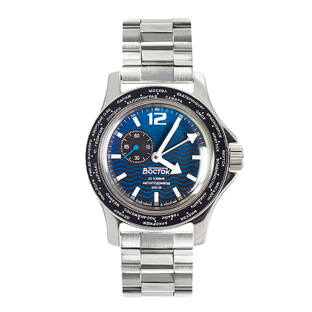 черный циферблат с синими волнами, белый шрифт, в позиции 12:00 надпись ВОСТОК, циферблат со светомассой