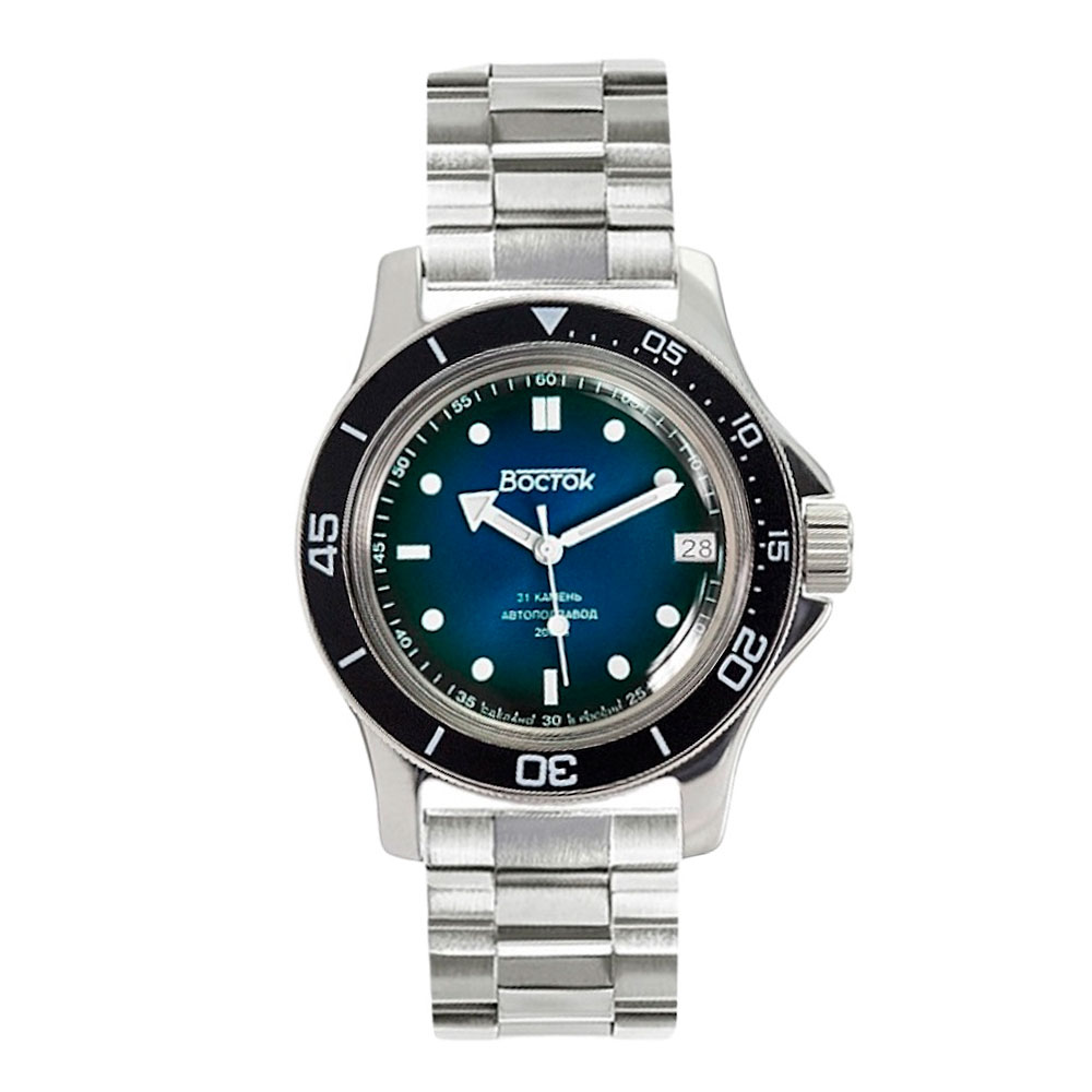 черно-синий циферблат, белый шрифт, в позиции 12:00 надпись ”ВОСТОК”, циферблат со светомассой