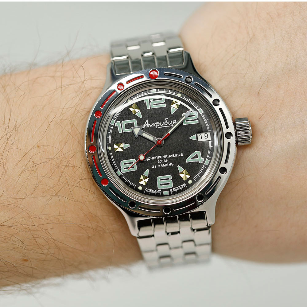 Эти практичные часы великолепно сидят на руке и позволят вам чувствовать себя уверенно в любой обстановке. Амфибия Классика. В механизме 31 камень, частота 19800 полуколебаний в час. Запас хода 31 час. Противоударное устройство оси баланса. Браслет с раскладывающейся застежкой. Производитель оставляет за собой право вносить изменения во внешний вид часов.