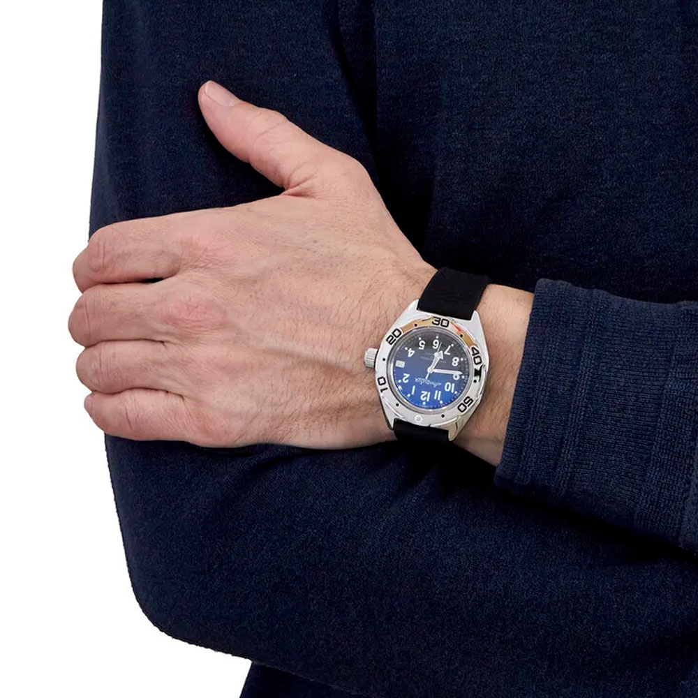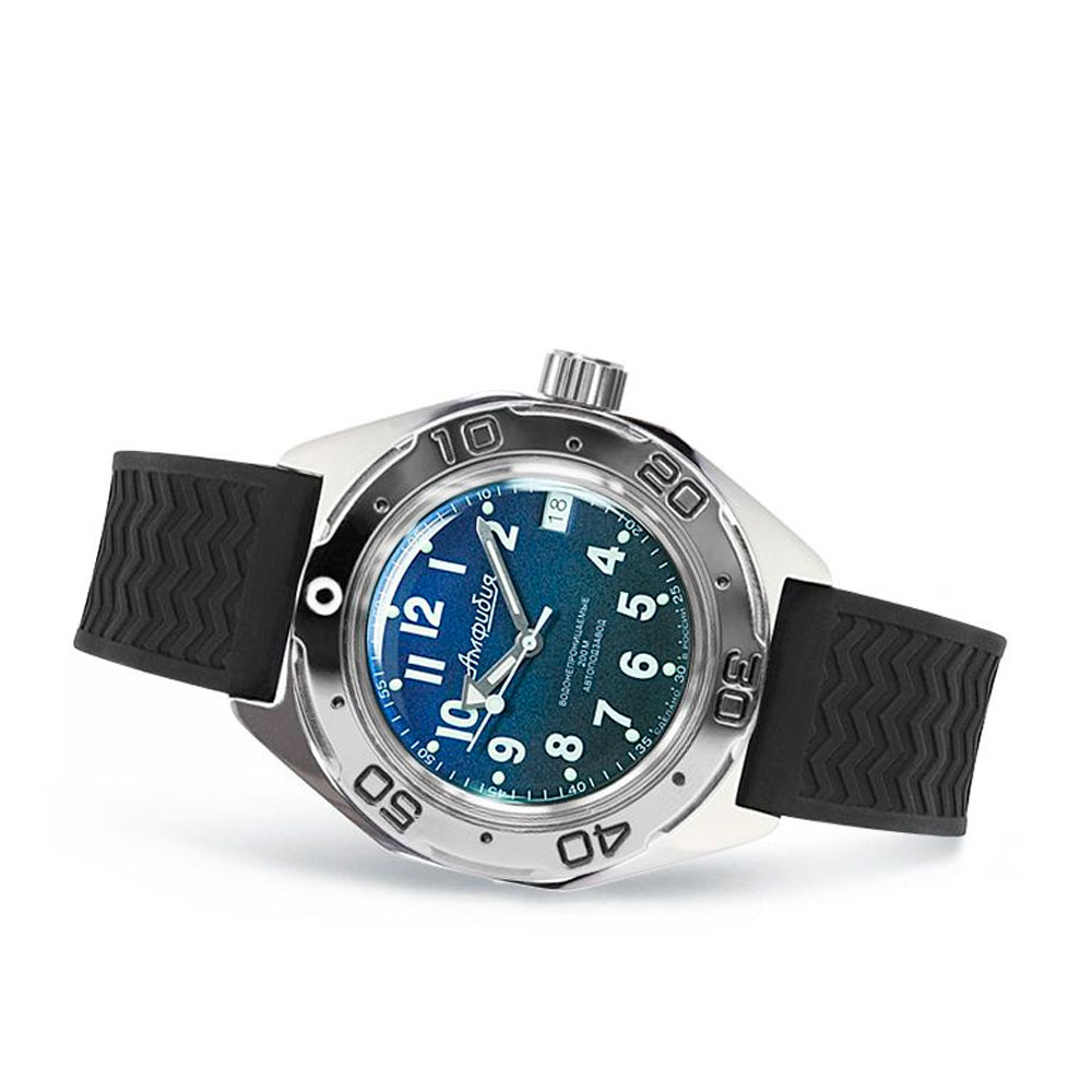 Мужские наручные часы Восток Амфибия на резиновом ремешке. В механизме 31 камень. Запас хода не менее 31 часа. Автоподзавод с предохранительным устройством от перезавода пружины. Календарь мгновенного действия. Центральная секундная стрелка. Противоударное устройство узла баланса. Часовые метки и стрелки заполнены флуоресцентной краской переменного действия для возможности считывания времени в темноте. Циферблат закрывает органическое стекло сферической формы. Вращающийся безель. Завинчивающаяся заводная головка.