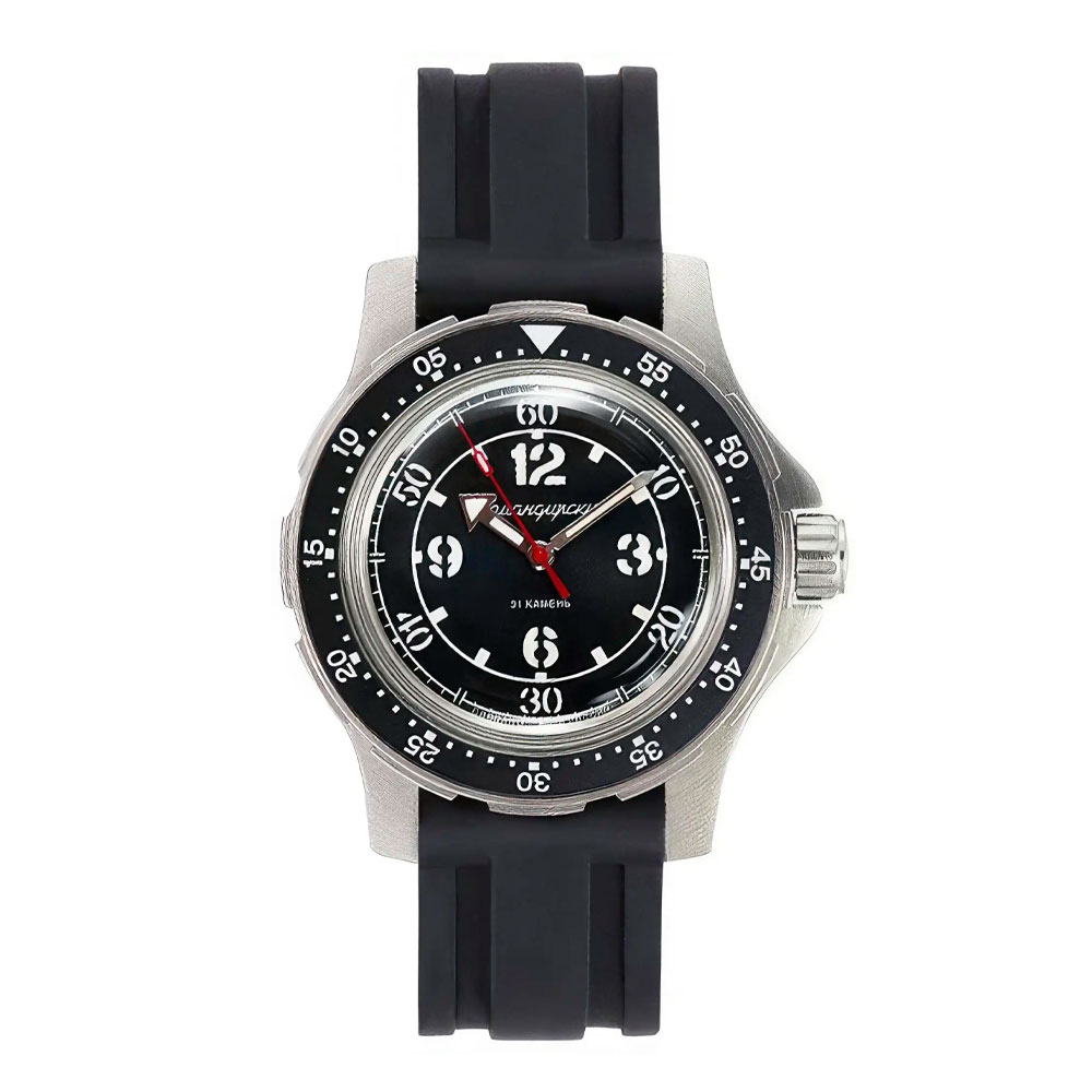 Мужские наручные часы Восток Командирские 18087А. Механические с ручным подзаводом. Полимерный ремешок. Натуральный полимерный материал является идеальным для изготовления ремешка благодаря своей чрезвычайной прочности и гибкости. Браслет из нержавеющей стали. Органическое стекло. Часы являются водонепроницаемыми до 20 Бар. Цвет циферблата: Серебристый. Цвет циферблата: Черный. Цвет корпуса: Черный. На стрелки и отметки нанесен светонакопительный состав, благодаря этому считывать информацию с циферблата возможно и в темноте. Толщина: 12 мм.