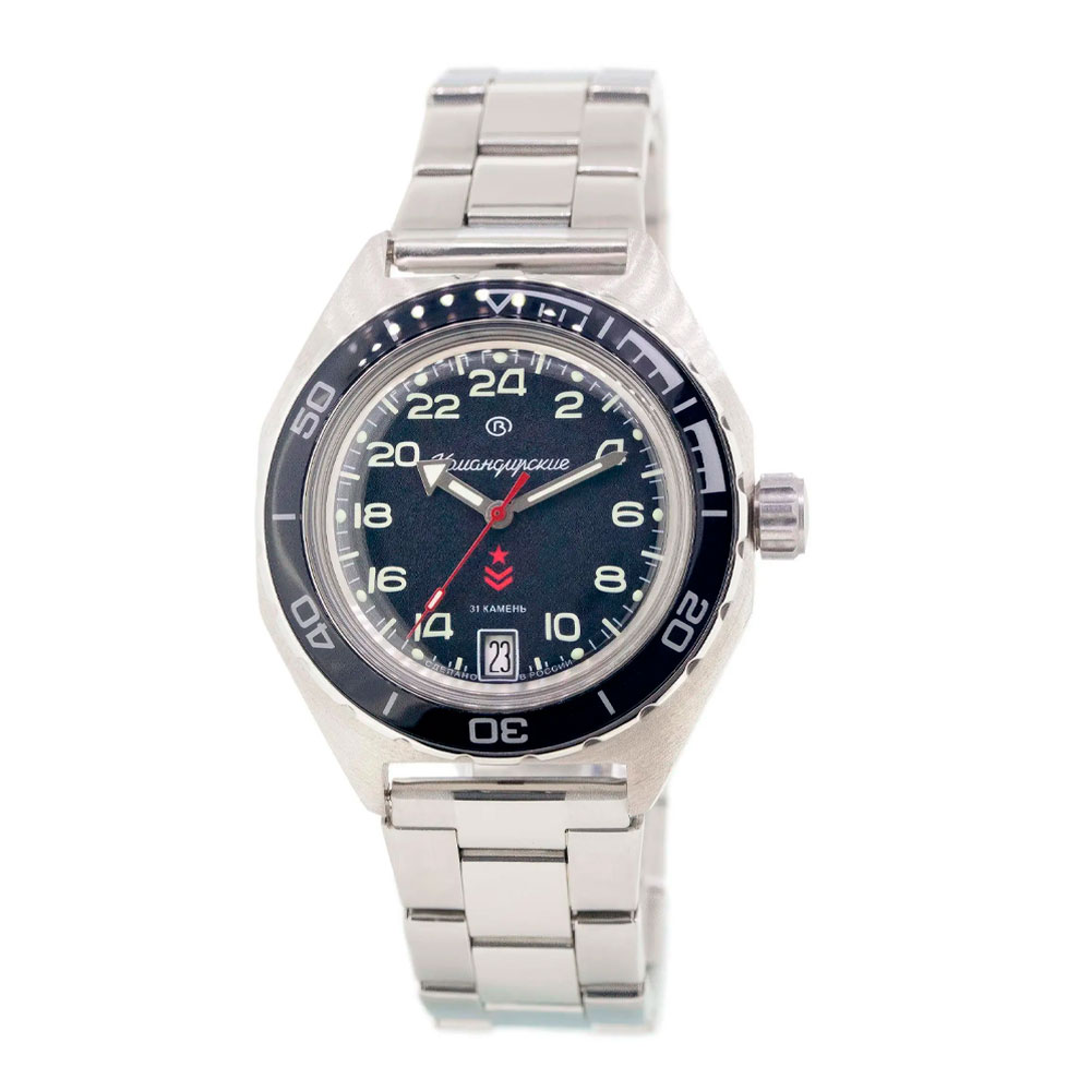 Мужские наручные часы Восток Командирские 650541. Механические с автоподзаводом. Пружина механизма заводится автоматически благодаря естественным движениям владельца в процессе ежедневной носки часов. Корпус изготовлен из высококачественной нержавеющей стали 316L с высокими антикоррозийными свойствами. На стрелки и отметки нанесен светонакопительный состав, благодаря этому считывать информацию с циферблата возможно и в темноте. На циферблате отображается текущее число месяца. Браслет из нержавеющей стали. Органическое стекло. Часы являются водонепроницаемыми до 20 Бар. Цвет корпуса: Черный. Ширина (с заводной головкой): 41мм. Толщина: 15мм.