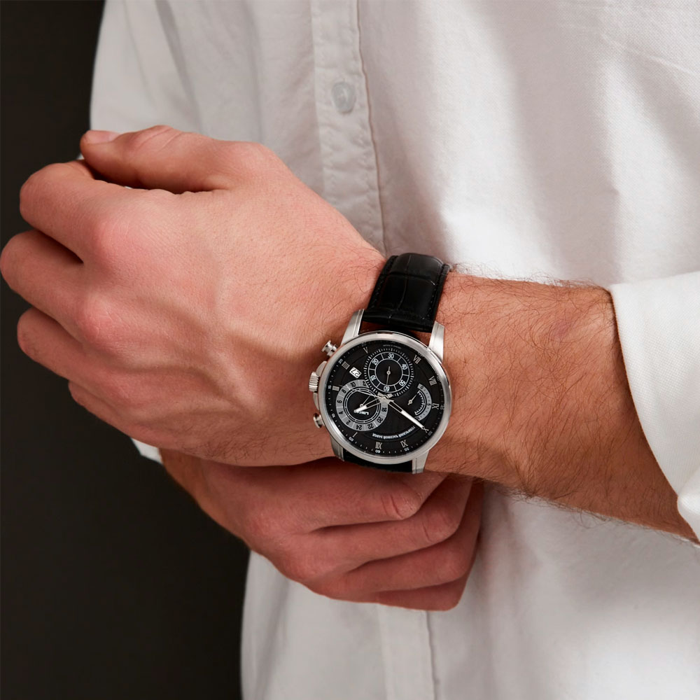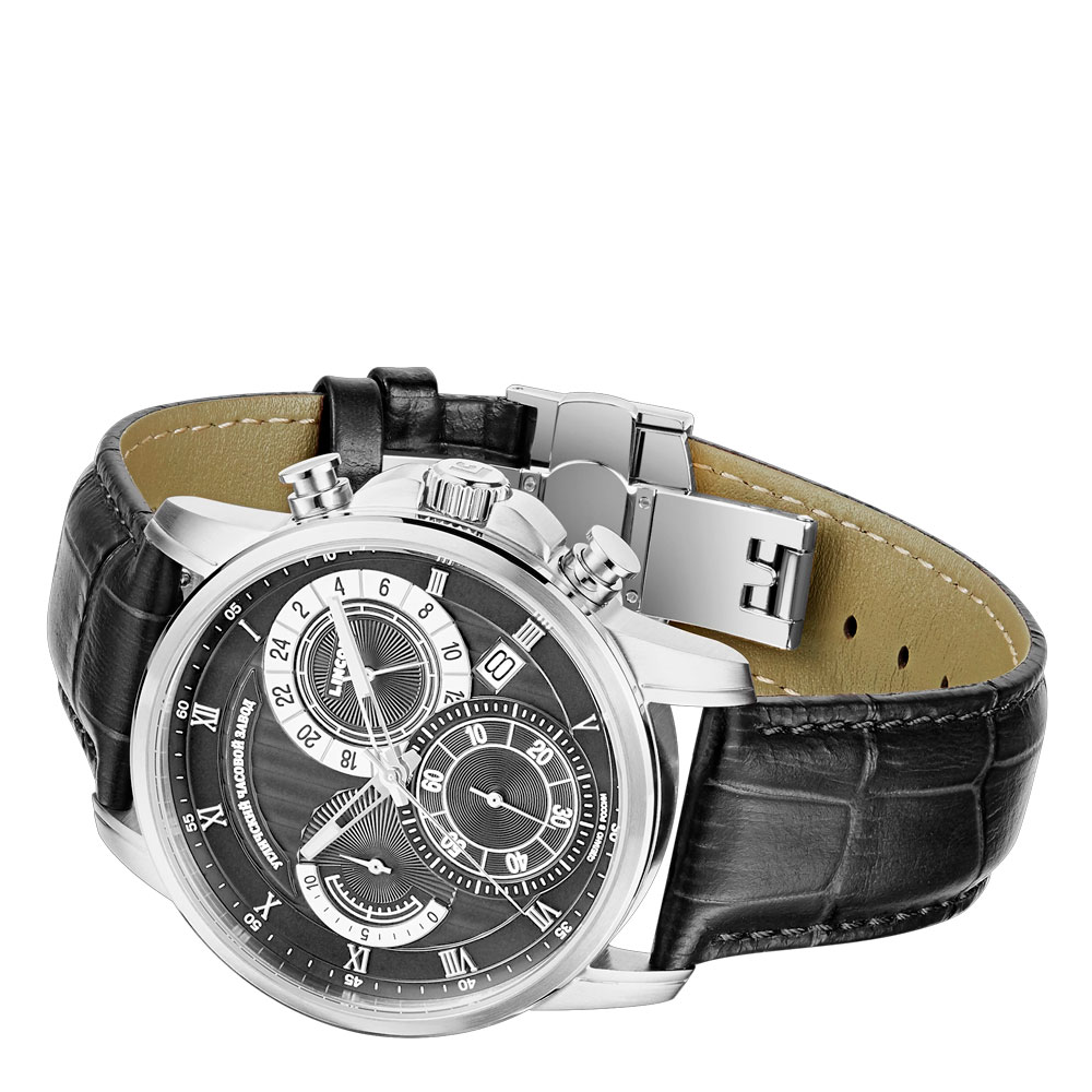 Мужская модель с хронографом - воплощение элегантности и функциональности, созданная с вниманием к каждой детали. Авторский дизайн сочетает в себе классический стиль и современные технологии, делая их идеальным аксессуаром для любого случая. Корпус диаметром 42 мм. выполнен из нержавеющей стали с сатинированной обработкой, что придает часам сдержанный блеск и устойчивость к царапинам. Водозащита 5 АТМ и сапфировое стекло надёжно защищают циферблат, декорированный изысканными гильошированными узорами на индикаторах хронографа и 24-х часовой шкале и дополненный окошком с указанием даты. Японский механизм гарантирует точность хода и удобство использования, а ремешок из натуральной кожи с застежкой-бабочкой обеспечивает комфорт и надежную фиксацию на запястье, завершая образ изысканного аксессуара.