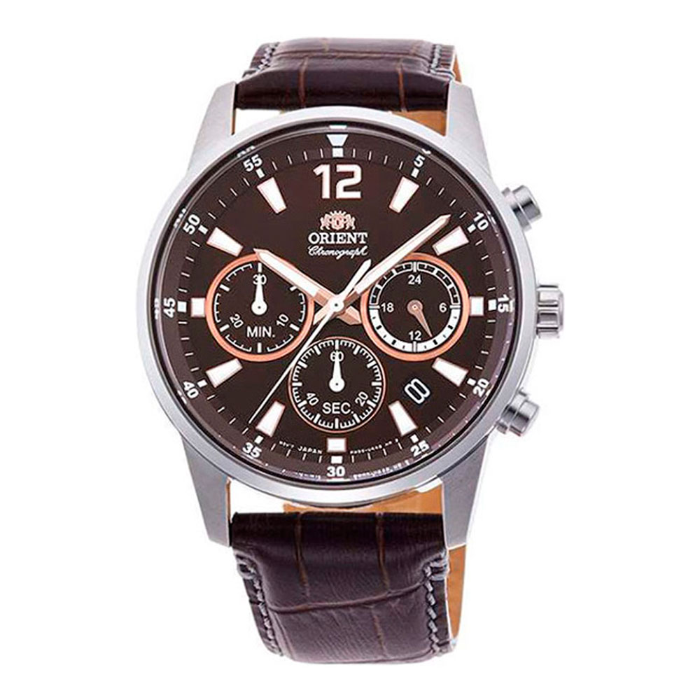 Кварцевые часы с хронографом. Часы, минуты, секунды, 12-24-х часовой формат времени. Индикация даты. Счетчик хронографа до 30 минут. Корпус выполнен из нержавеющей стали. Люминесцентные стрелки и метки. Коричневый кожаный ремешок. Мужские кварцевые наручные часы с хронографом (секундомером) Orient RA-KV0006Y (RA-KV0006Y10B). Калибр механизма — KV. На данной модели отображается дата и время суток (24-х часовая шкала). Секундомер может отсчитывать до 30-ти минут. Стрелки и метки покрыты люминесцентным напылением (светятся в темноте). Кожаный ремешок. Завинчивающаяся задняя крышка. Водонепроницаемость WR10 (10 атм).