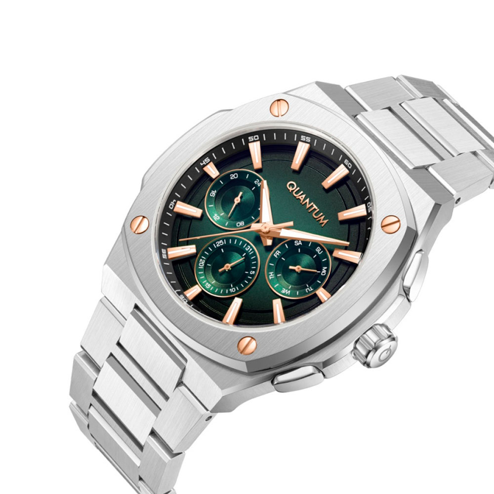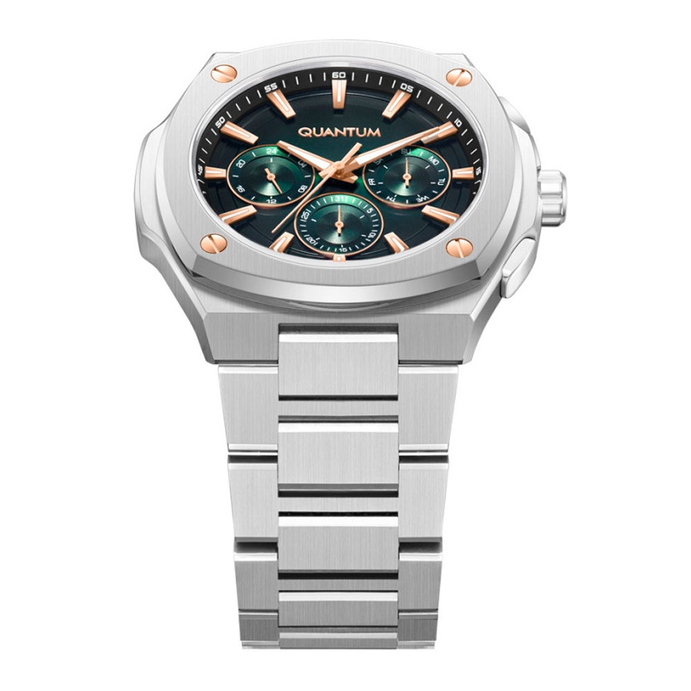 Мужские часы Quantum со спортивно-повседневным дизайном из коллекции Adrenaline. Зеленый многофункциональный дисплей с золотистыми деталями. Люминесцентное покрытие на стрелках и индексах. Минерально-хрустальное стекло. Корпус и цепь изготовлены из нержавеющей стали. Диаметр корпуса 44 мм. В ход входит кварцевый механизм калибра VX9J. Водонепроницаемость 10 АТМ - позволяет купаться в водоемах.