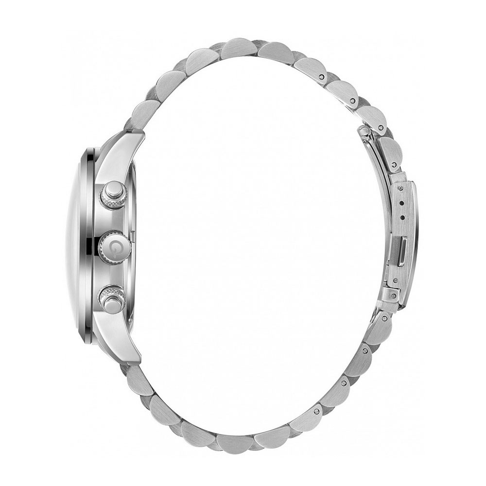 Браслет из нержавеющей стали дополнен раскладывающейся застежкой, обеспечивающей надежную фиксацию на руке. Завинчивающаяся задняя крышка повышает степень защиты механизма.