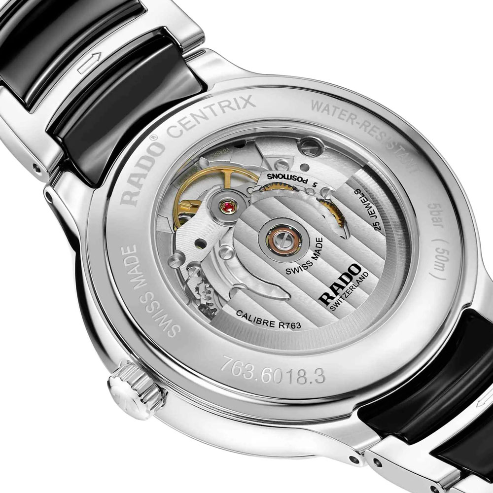 Аксессуар с чёрным циферблатом являет собой сочетание классической красоты и современного дизайна, отражающего минимализм. Его безупречная работа обеспечивается за счёт швейцарского автоматического механизма с 80-часовым запасом хода. Прозрачная задняя крышка позволяет прикоснуться к часовому искусству и понаблюдать за движением деталей. Сапфировое стекло. Браслет из нержавеющей стали и высокотехнологичной плазменной керамики. Водонепроницаемость 50 метров. . Окошко даты.