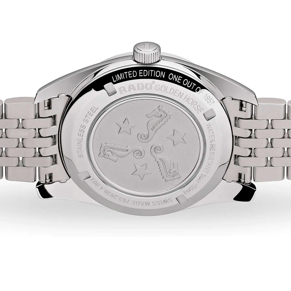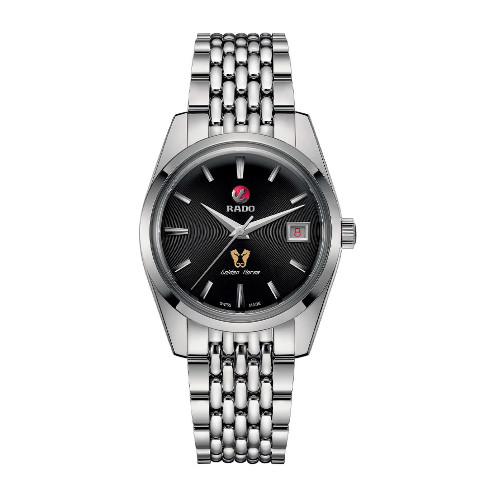 Модель относится к премиальному сегменту, стильно смотрится чёрный узорчатый циферблат с контрастными элементами. Нижняя часть дополнена эмблемой в виде морских коньков, в верхней находится узнаваемый логотип Rado. Часы сделаны из нержавеющей стали 316L, как и первые аксессуары из линейки Golden Horse. Корпус защищает автоматический механизм ETA C07.611 с резервом хода 80 часов от ударов и повреждений. Задняя крышка имеет отличительную гравировку. Сапфировое стекло с покрытием «антиблик». Водостойкость до 5 бар. Отображение текущего числа. Диаметр корпуса: 36,5 мм.