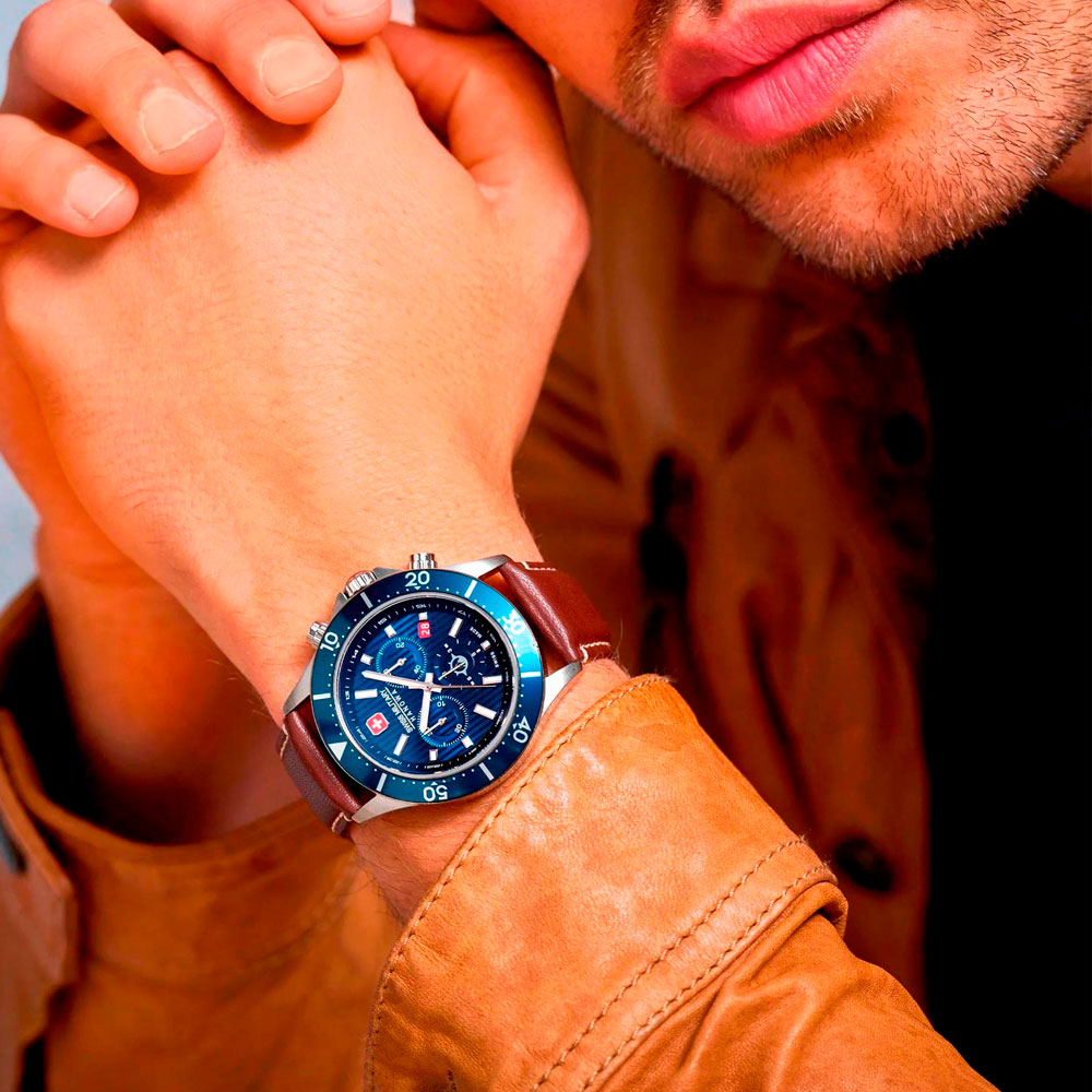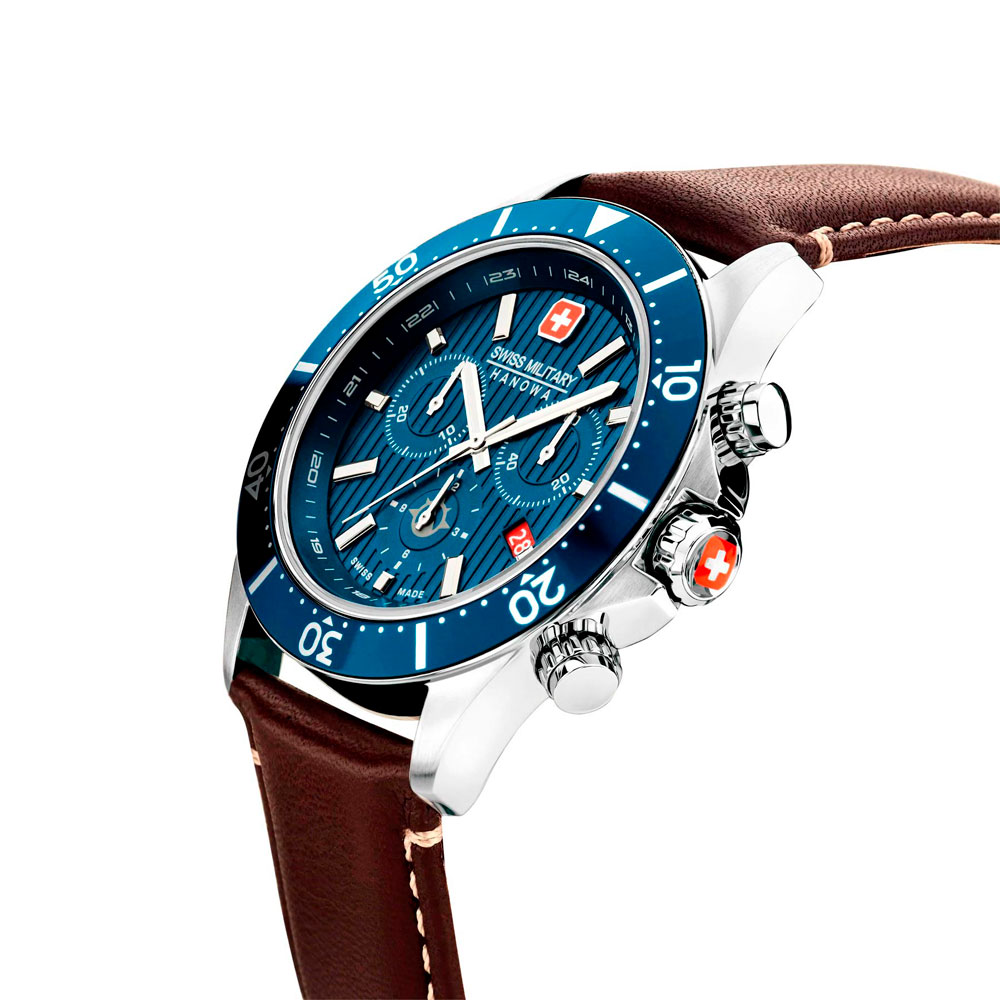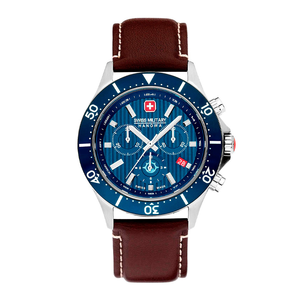 С этими функциональными швейцарскими часами вы легко сможете подстроиться под бурный ритм современного мегаполиса. Практичные наручные часы Flagship X. Часы-хронограф с секундомером. 12-ти и 24-х часовой формат времен. Круглый стальной корпус. Циферблат украшен рельефным декоративным узором в виде вертикальных линий и дополнен фирменным логотипом Swiss Military Hanowa в положении 12 часов. Заостренные прямоугольные стрелки и метки с люминесцентным покрытием, которое светится в темноте после непродолжительной зарядки на свету. Окошко даты находится в положении 4 часов. Метки в виде штрихов. Рифленая заводная головка с защитой, украшена фирменным логотипом. Удобный ремешок из натуральной кожи с классической застежкой.