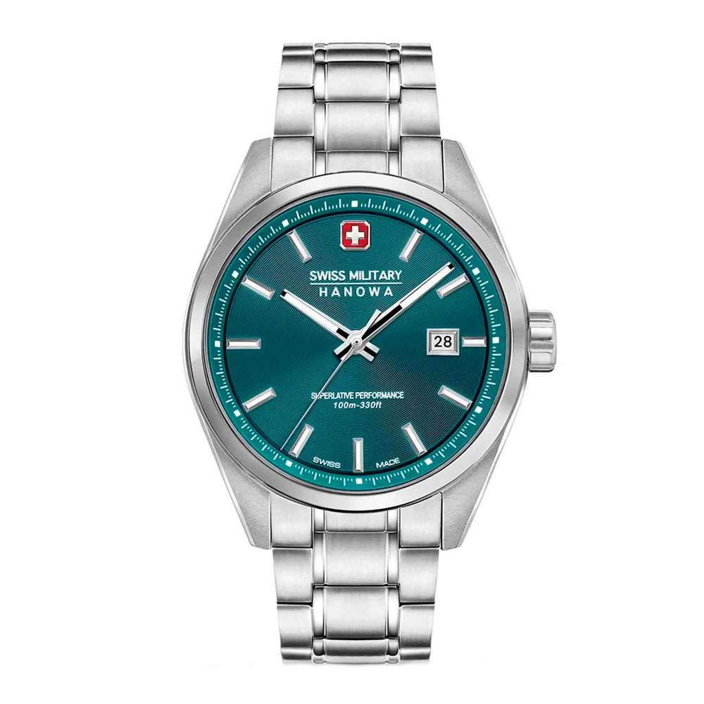 Мужские часы Swiss Military Hanowa SMWGH0004104 Pioneer идеально сочетают в себе швейцарскую точность и современный дизайн. Эти часы оснащены надежным кварцевым механизмом, обеспечивающим безупречную работу и долговечность. Корпус часов выполнен из нержавеющей стали, что придает им прочность и стильный внешний вид. Диаметр корпуса составляет 41 мм, что делает их оптимальными для повседневного ношения. Сапфировое стекло защищает циферблат от царапин и сохраняет его первозданный вид на протяжении долгого времени. Бирюзовый циферблат с индексами и и стрелками светящимися в темноте благодаря люминесцентному покрытию обеспечивает отличную читаемость и подчеркивает строгий стиль модели. Функция отображения даты, расположенная на отметке «3 часа», обеспечивает дополнительное удобство и функциональность. Внутри установлен швейцарский кварцевый механизм Ronda 515, обеспечивающий высокую точность хода. Браслет из нержавеющей стали с раскладной застёжкой гарантирует надежную фиксацию на запястье и комфорт в носке, а водозащита до 10 атмосфер позволяет не беспокоиться о сохранности часов в различных условиях.