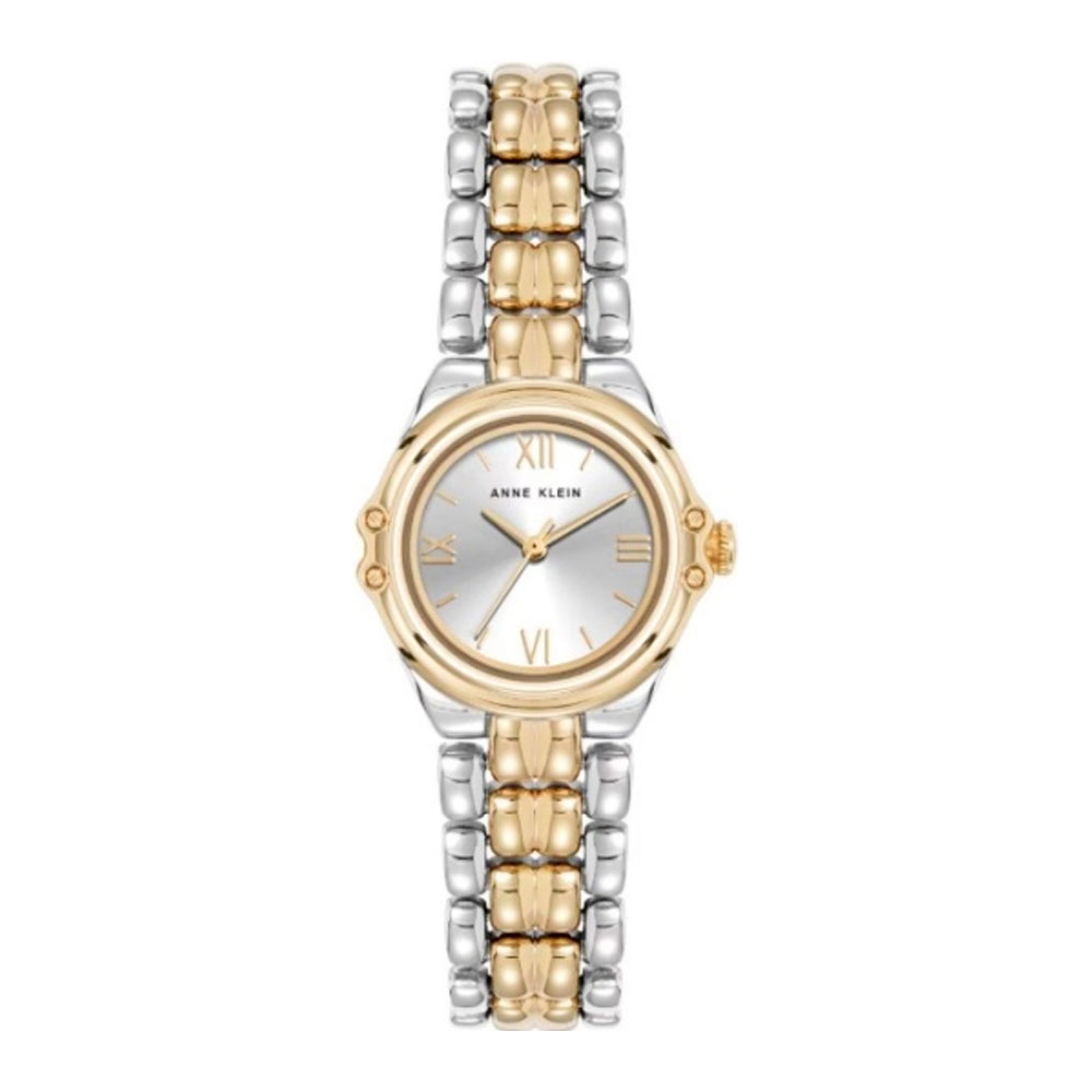 Anne Klein 5363SVTT — это изысканный двухцветный танец серебра и золота на женском запястье, где круглый корпус грациозно обнимает циферблат, излучающий тихую гармонию.