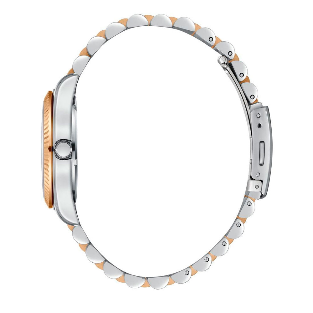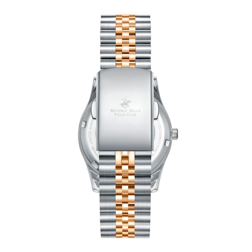 Beverly Hills Polo Club BP3169C.560 — женские часы, сочетающие изящество и функциональность в компактном формате. Корпус из суперметалла диаметром 34 мм и браслет. Циферблат украшен тремя субциферблатами — индикаторы даты, дня недели и 24‑часового формата — что придаёт модели утончённую многозадачность. Стрелки и метки выполнены в золоте, подчёркивая элегантность и визуальную лёгкость. Безель с IP‑покрытием . Механизм — точный кварцевый, надёжный и неприхотливый, требующий только замены батареи раз в 1–2 года . Циферблат покрыт прочным минеральным стеклом, устойчивым к царапинам и сохраняющим безупречный внешний вид . Браслет с IP‑покрытием оснащён удобной застёжкой “бабочка”, обеспечивая плавное и надёжное прилегание. Водозащита на уровне 3 ATM (≈30 м) защищает от брызг и случайных осадков . Beverly Hills Polo Club — утончённый аксессуар для женщин, ценящих стиль, надёжность и изысканные детали, где каждая функция подчёркнута строгой, но изящной эстетикой.