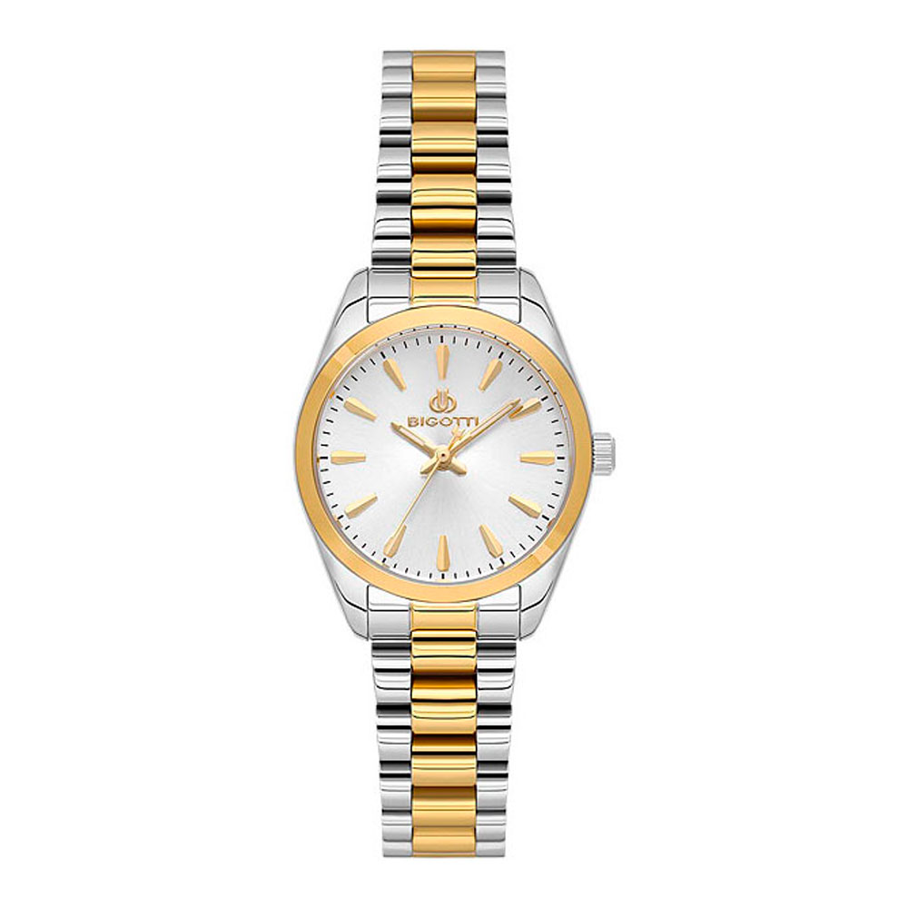 Женские кварцевые часы. Центральные часовая, минутная и секундная стрелки. Серебристый циферблат. Круглый корпус выполнен из нержавеющей стали с частичным IP покрытием цвета желтого золота. Диаметр корпуса составляет 28 мм. Стальной браслет с частичным покрытием, раскладывающаяся застежка. Прочное минеральное стекло устойчивое к мелким механическим повреждениям. Водостойкость WR 30 (брызги).