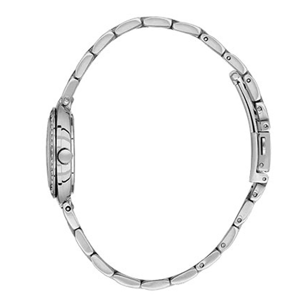 Женские кварцевые часы. Центральные часовая, минутная и секундная стрелки. Серебристый циферблат. Круглый корпус выполнен из нержавеющей стали и декорирован кристаллами по безелю. Диаметр корпуса составляет 28 мм. Стальной браслет, раскладывающаяся застежка. Прочное минеральное стекло устойчивое к мелким механическим повреждениям. Водостойкость WR 30 (брызги).