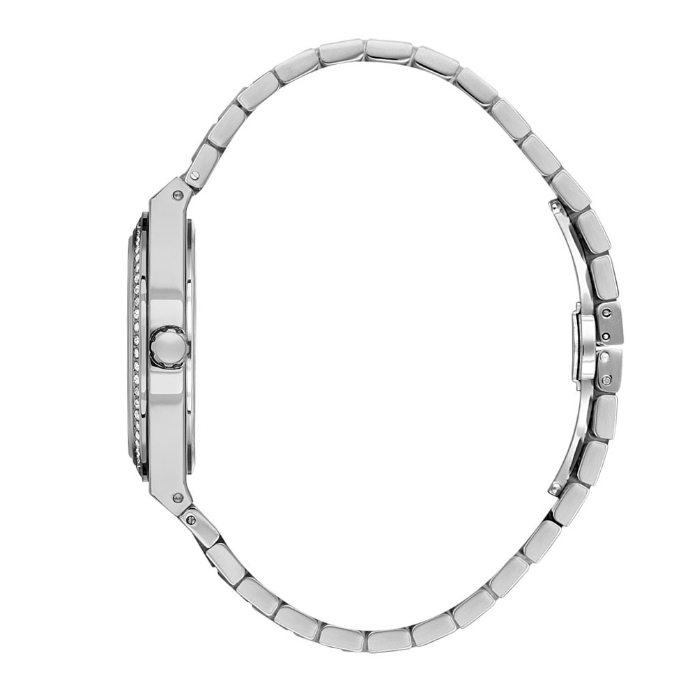 Женские кварцевые часы. Калибр механизма VX3J. Центральные часовая, минутная и секундная стрелки. Отображение даты и дня недели в малых циферблатах. 12/24х часовой формат времени. Черный циферблат. Круглый корпус выполнен из нержавеющей стали и декорирован кристаллами по безелю. Диаметр корпуса составляет 38 мм. Стальной браслет, раскладывающаяся застежка. Прочное минеральное стекло устойчивое к мелким механическим повреждениям. Водостойкость WR 50 (мытье рук, дождь).